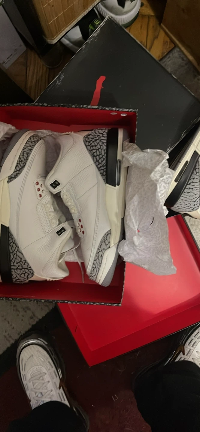 Selling a pair of Nike Air Jordan 3 Retro cements sneakers. They come with the original box. Check out the photos for the condition! Have 3 pairs these come out every 10 yrs or so only if they do at again last dropped 1989,1999, 2023 Jordan 3 retro OG Cements have 3 pairs 1 -6.5y…7y and then regular 7men fits like a 7.5 great sneakers definitely collector sneakers but also great to wear when buying some have a limit of 1 per person every Jordan I’ve listed and still listing all had max 1 per person so get 1 from say footlocker 1 Nike online 1 jimmy jazz or stadium goods or champs… in boxes brand new