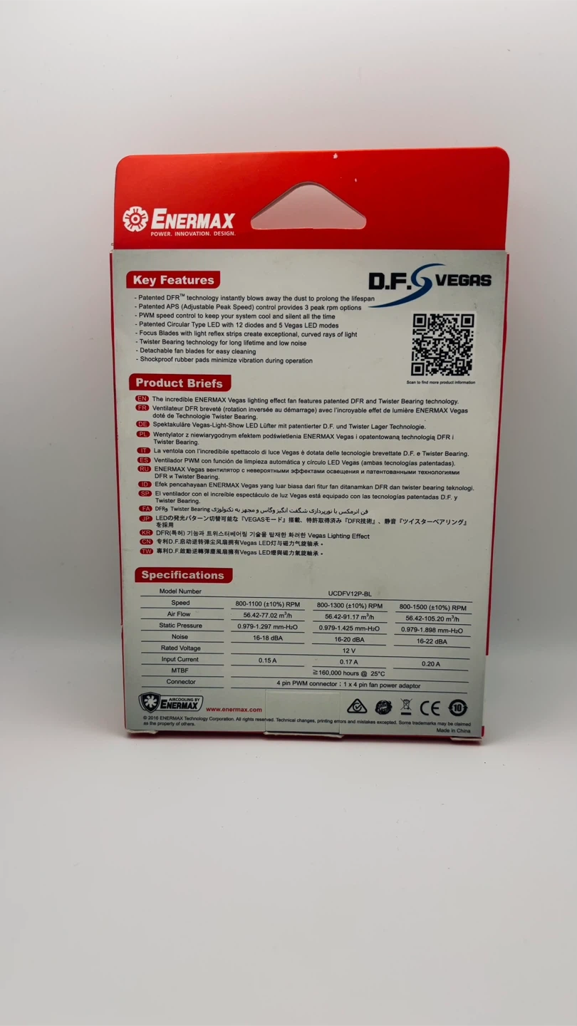 Selling an Enermax D.F. Vegas 12cm case fan! This fan features patented DFR technology for dust-free rotation and adjustable peak speed control. It also has selectable LED modes for a cool lighting effect. The box is included! Selling this item in great condition — clean, well-kept, and from a smoke-free, pet-free home.