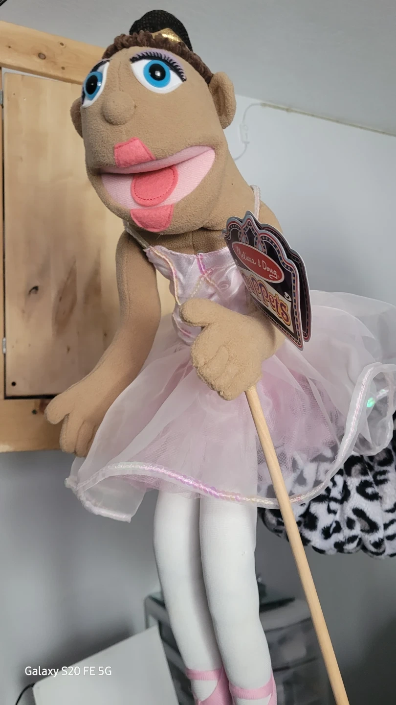 This is a Melissa & Doug Puppets ballerina puppet. It's dressed in a pink tutu and has a gold crown. Includes a wooden stick for control. Insert hand add voice and watch your little humans laugh and play. Tina ballerina is new, she has been discontinued this has driven her into a collectible!. 40.. obo.