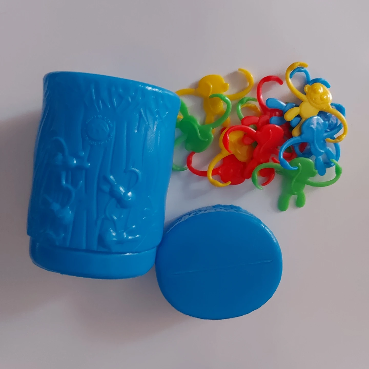 Classic Barrel of Monkeys game with a blue barrel and multiple colourful monkeys. It's a fun game for kids!