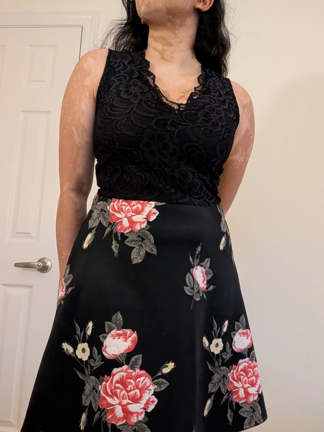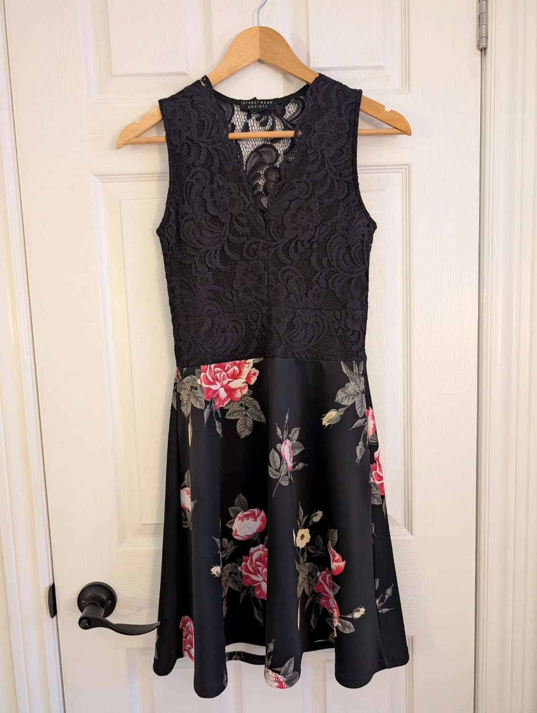 This is a sleeveless black dress with a lace overlay on the top and a floral print skirt. It has a V-neckline and a flattering fit-and-flare silhouette. The skirt reaches just above the knee, and the back is see-through.