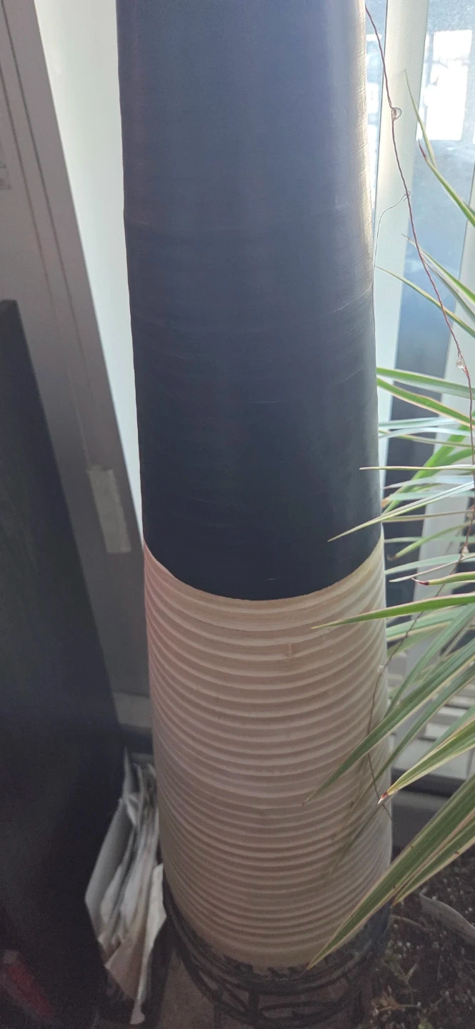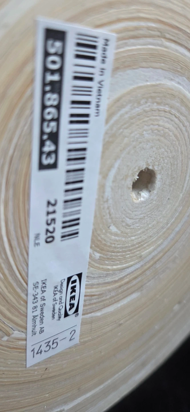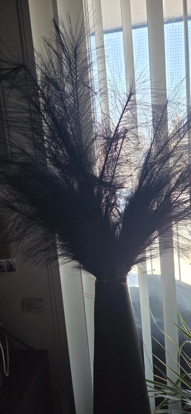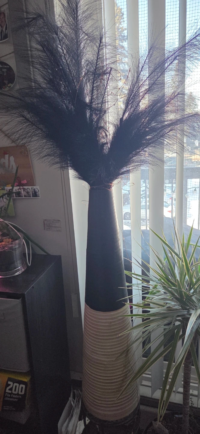 This IKEA vase is very tall, and has black faux pampas and white mini lights in it. It's made of bamboo, and is a very sturdy vase! A unique piece for your living room!