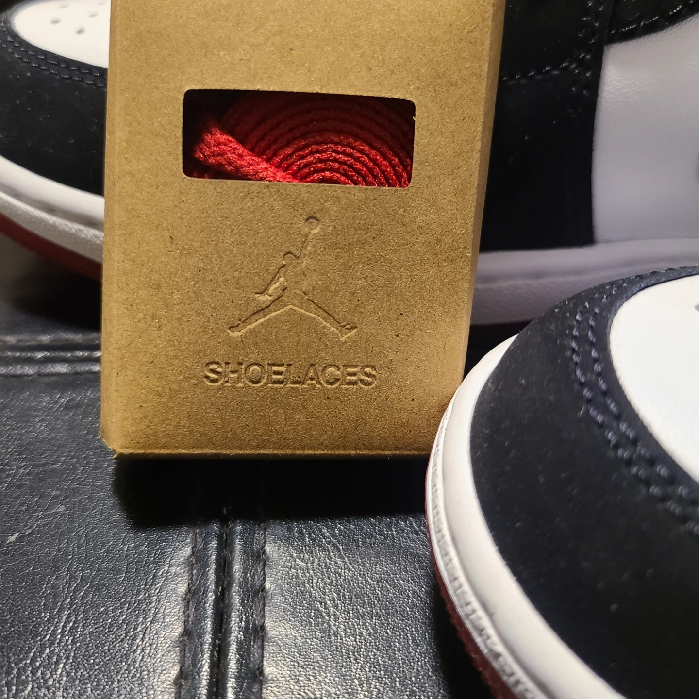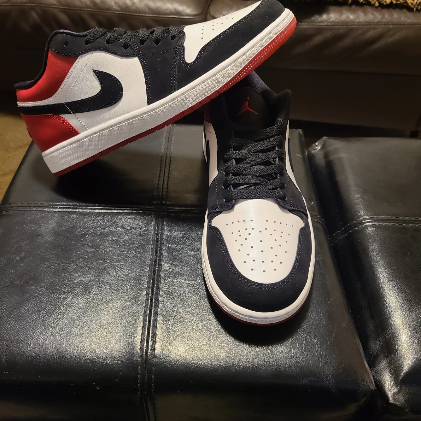 Selling a pair of Air Jordan 1 Low SE sneakers in white, black, and varsity red! They are a size 10. Comes with the box and an extra pair of red shoelaces! 2025 collection