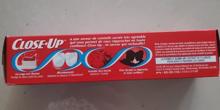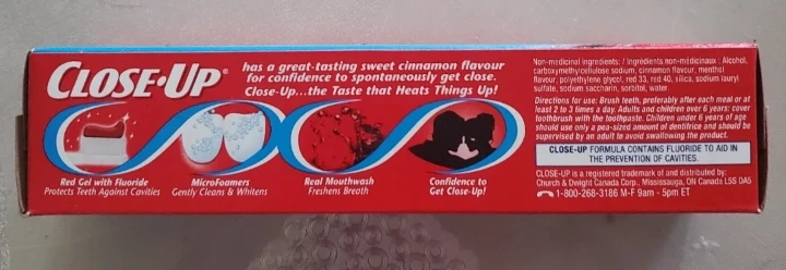 This Close-Up whitening gel toothpaste comes in a great-tasting sweet cinnamon flavour. It's designed to cleanse gently and whiten your teeth. Each tube contains 100mL of toothpaste. It has a mouthwash function. Each toothpaste costs 2.50$