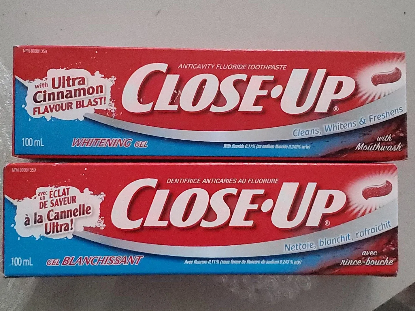 This Close-Up whitening gel toothpaste comes in a great-tasting sweet cinnamon flavour. It's designed to cleanse gently and whiten your teeth. Each tube contains 100mL of toothpaste. It has a mouthwash function. Each toothpaste costs 2.50$