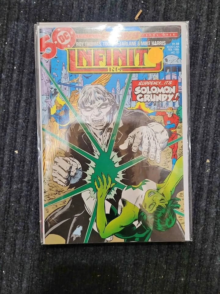 Crisis On Infinite Earths crossover. Northwind, Jade and Brainwave try to stave off Feithera's destruction (with a little help from Solomon Grundy) in "Feithera by Stormlight!" Script by Roy Thomas, co-plot by Dann Thomas, pencils by Todd McFarlane and Mike Harris, inks by Steve Montano and Tony DeZuniga. 1-page pin-up of the Silver Scarab by McFarlane and DeZuniga. 28 pages of story. McFarlane/DeZuniga cover.