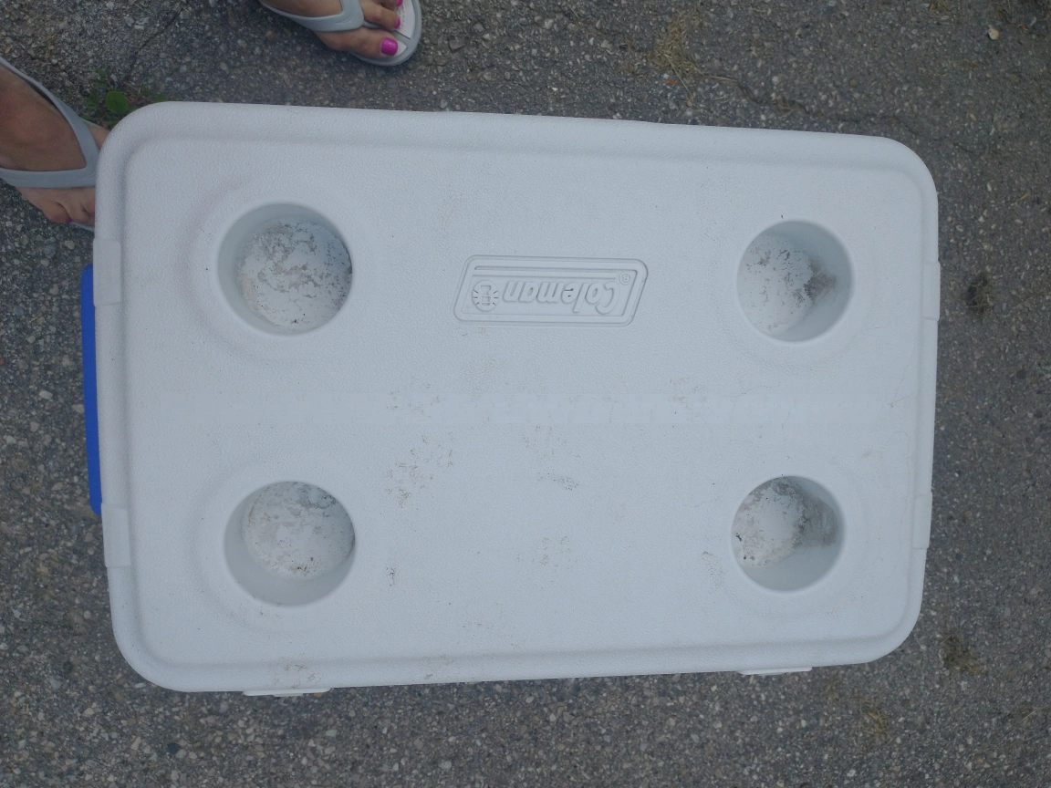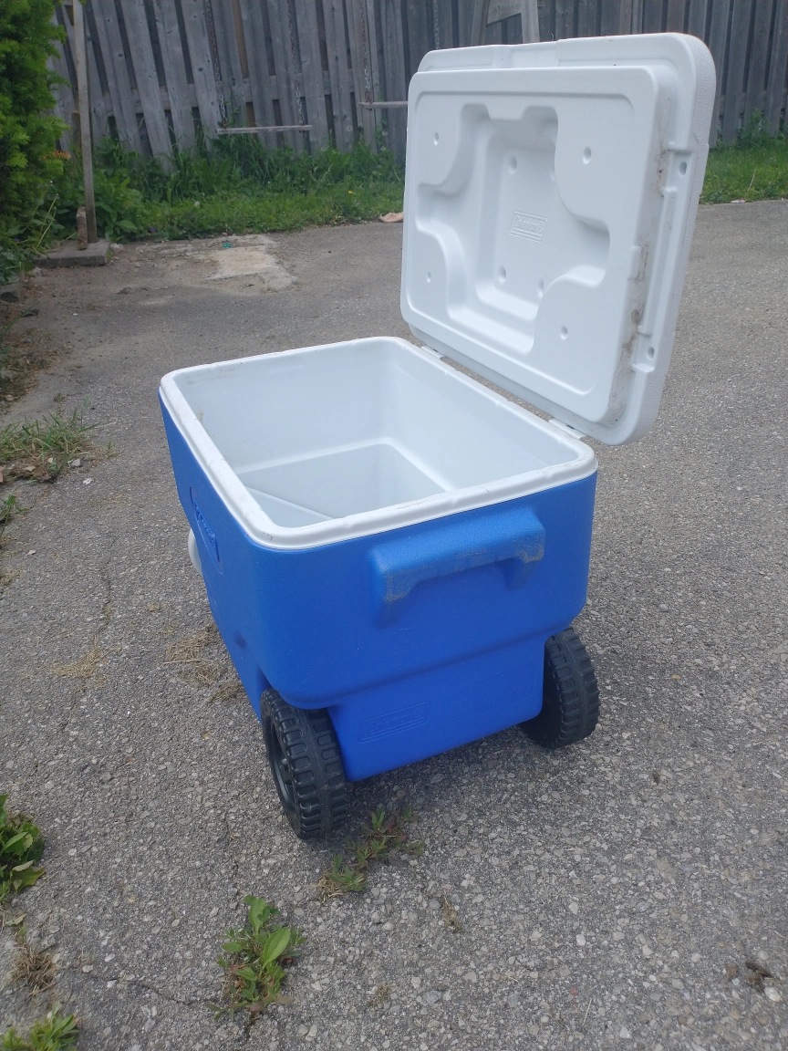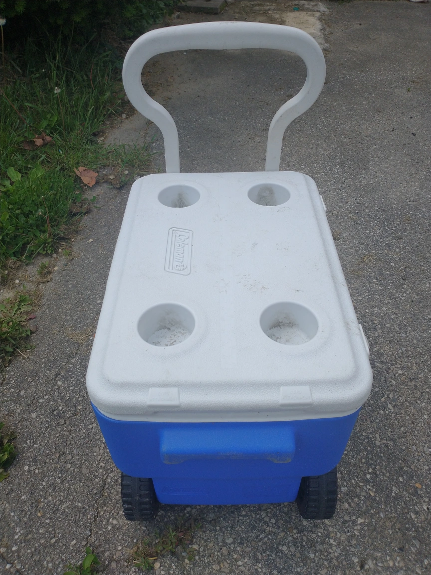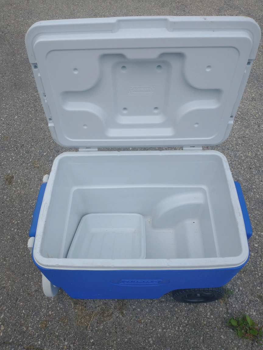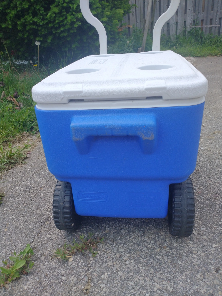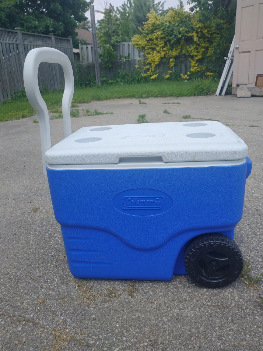 Blue and white cooler. Features wheels and a handle for easy transport. It has cup holders on top. You can enjoy a relaxing picnic with this cooler.