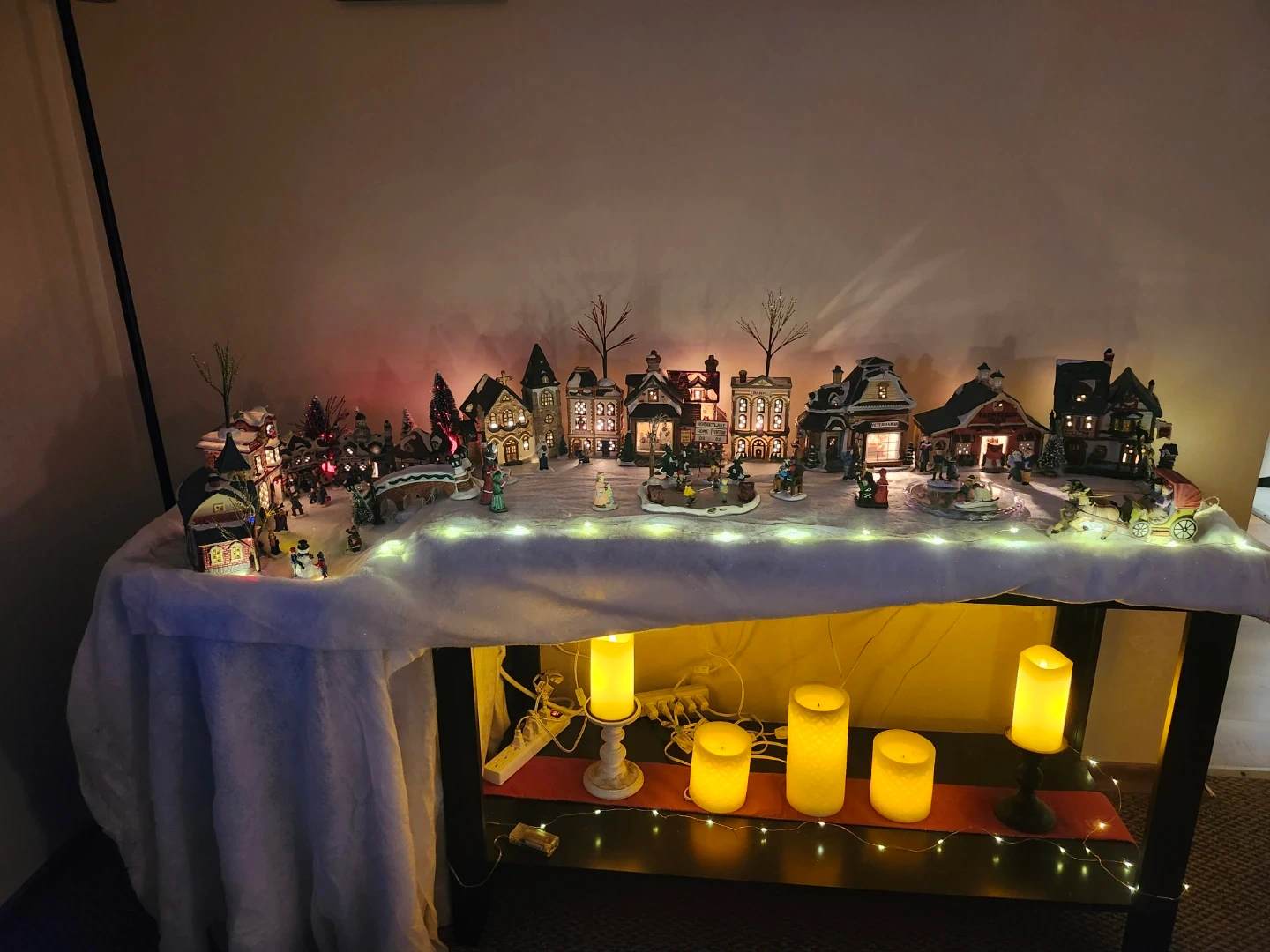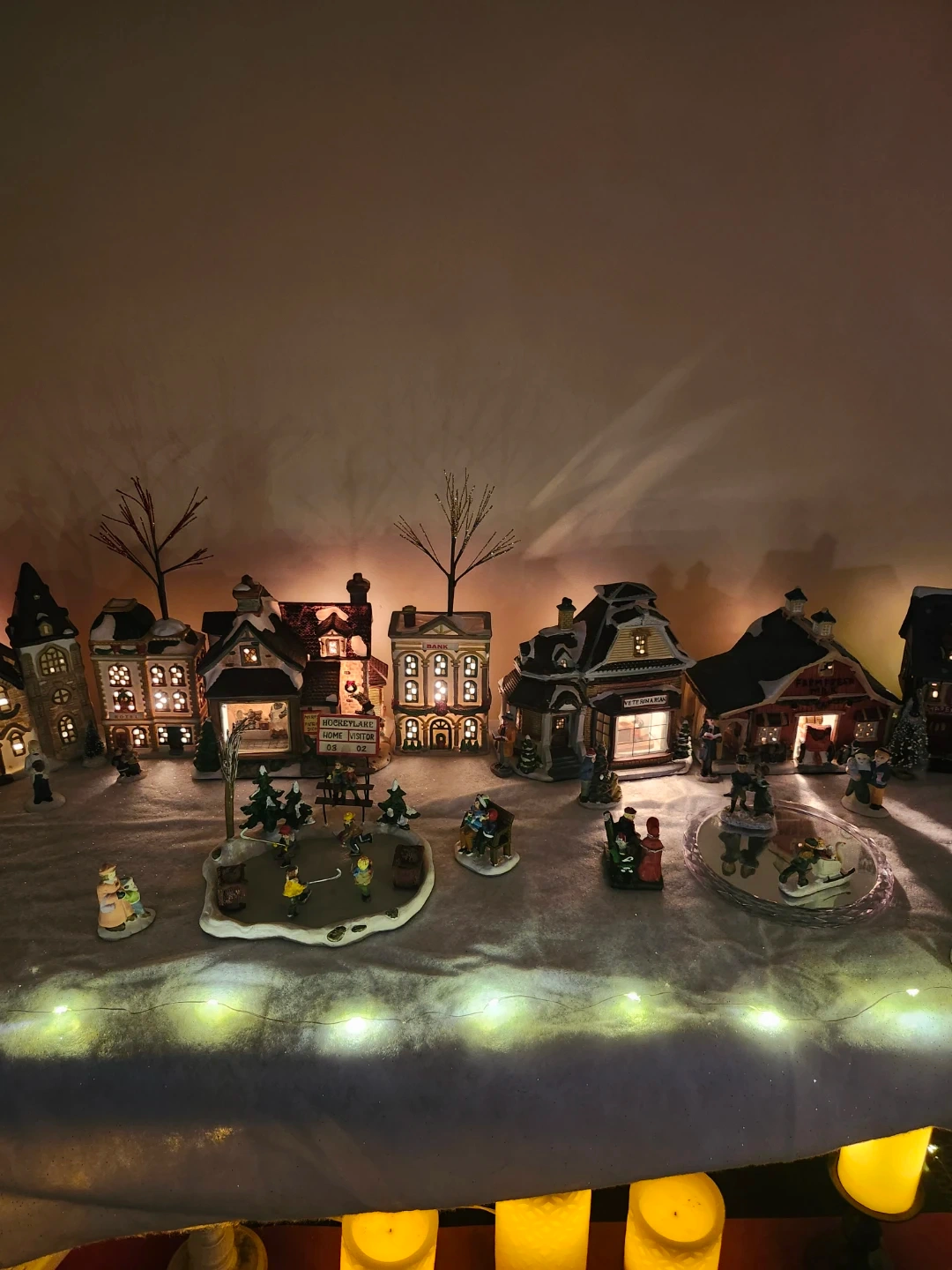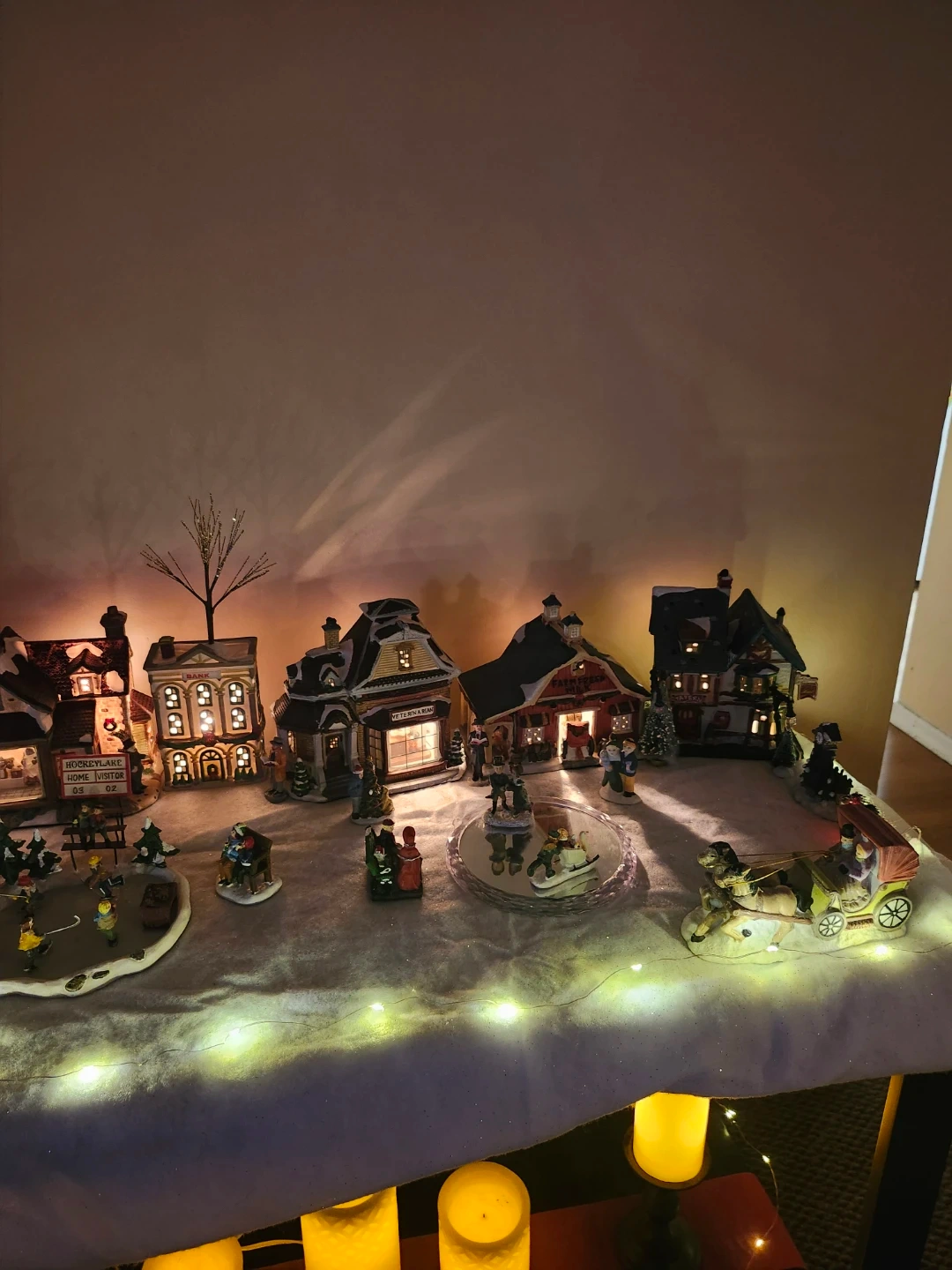 A charming collection of illuminated Christmas village buildings and figurines, set on a snowy display. This festive scene includes various houses, a skating rink, and people, all lit with warm lights to create a cozy holiday atmosphere. It's perfect for creating a captivating holiday display. The candles below are not for sale. Available for pickup only, no hold, cash only please. All are in original boxes within bigger boxes, for better transport.