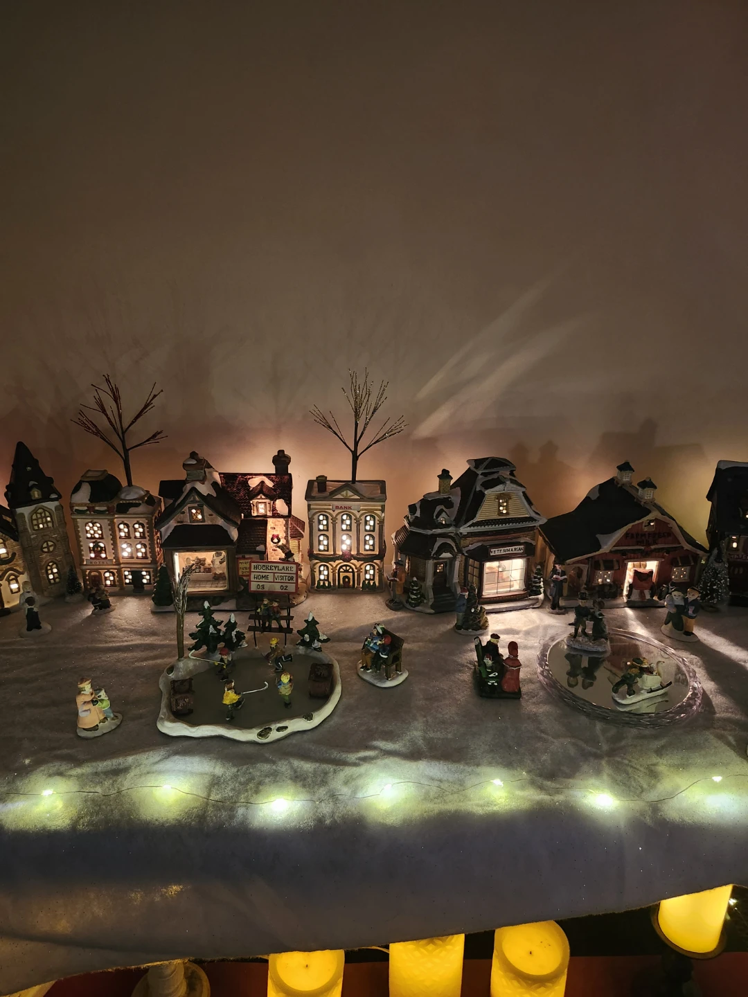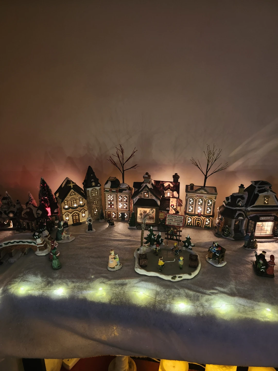 A charming collection of illuminated Christmas village buildings and figurines, set on a snowy display. This festive scene includes various houses, a skating rink, and people, all lit with warm lights to create a cozy holiday atmosphere. It's perfect for creating a captivating holiday display. The candles below are not for sale. Available for pickup only, no hold, cash only please. All are in original boxes within bigger boxes, for better transport.