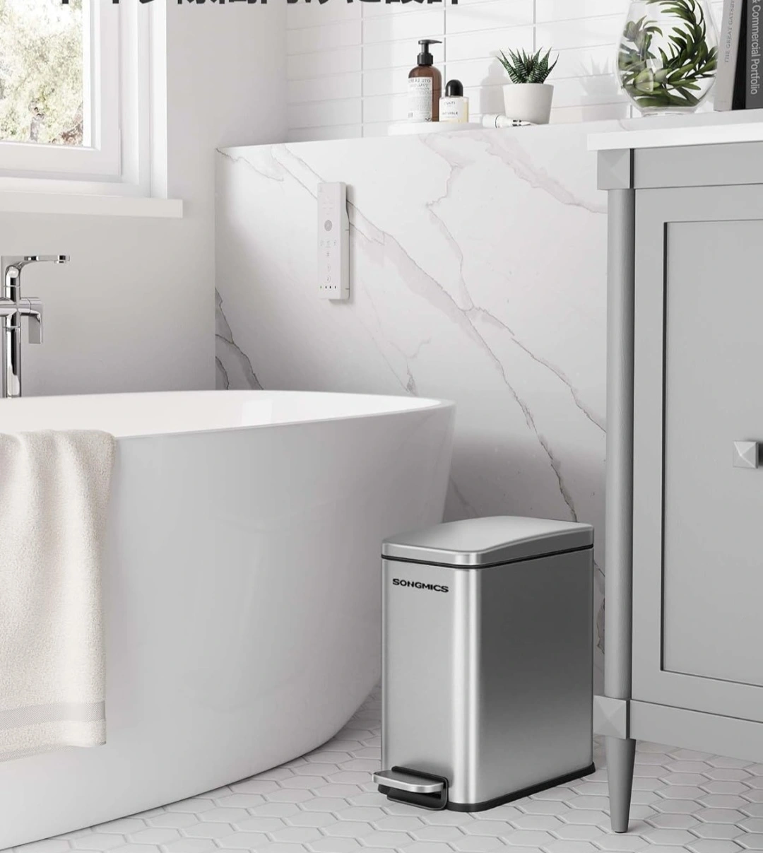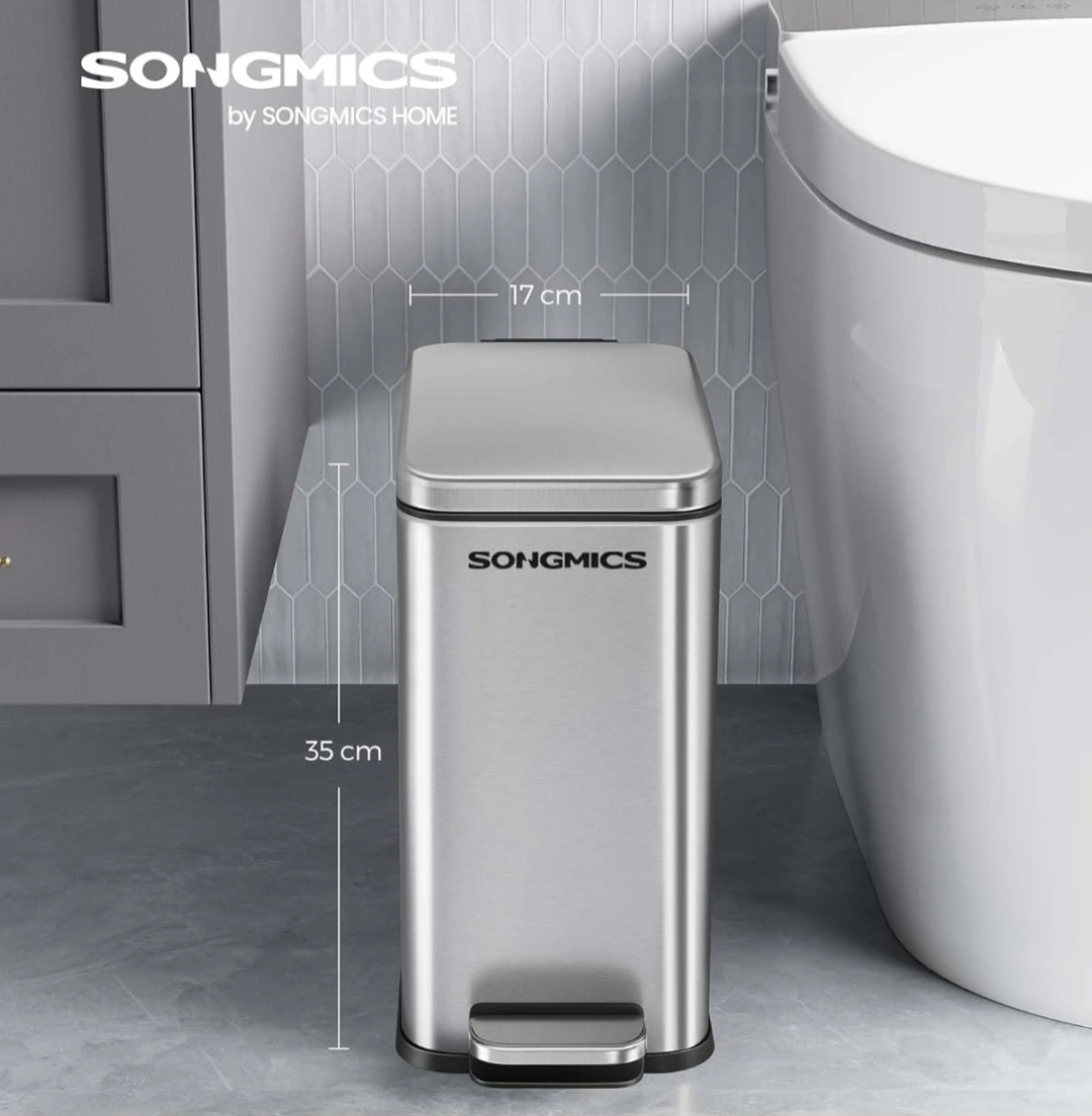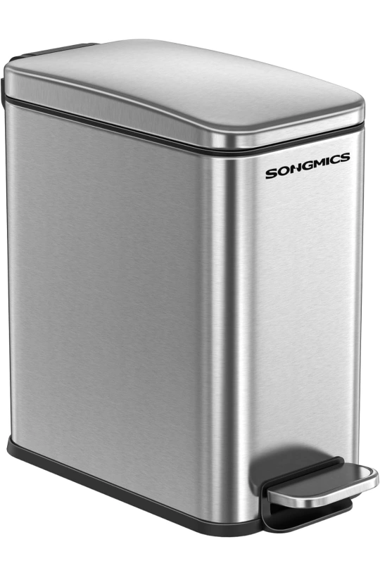 SONGMICS LTB561E10V1 Slim Trash Can, Width 6.7 inches (17 cm), Lid Included, 3.2 gal (10 L), Pedal Type, Small Dust Box, For Kitchen, Living Room, Washroom Gap, Quiet, Space Saving, Stainless Steel