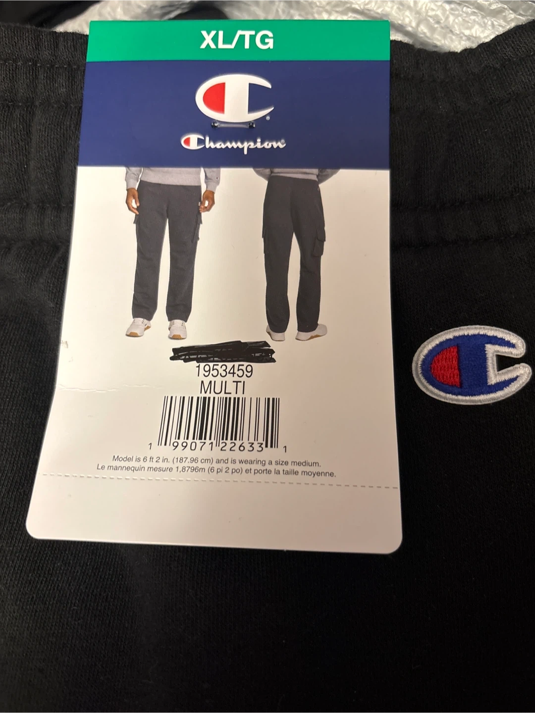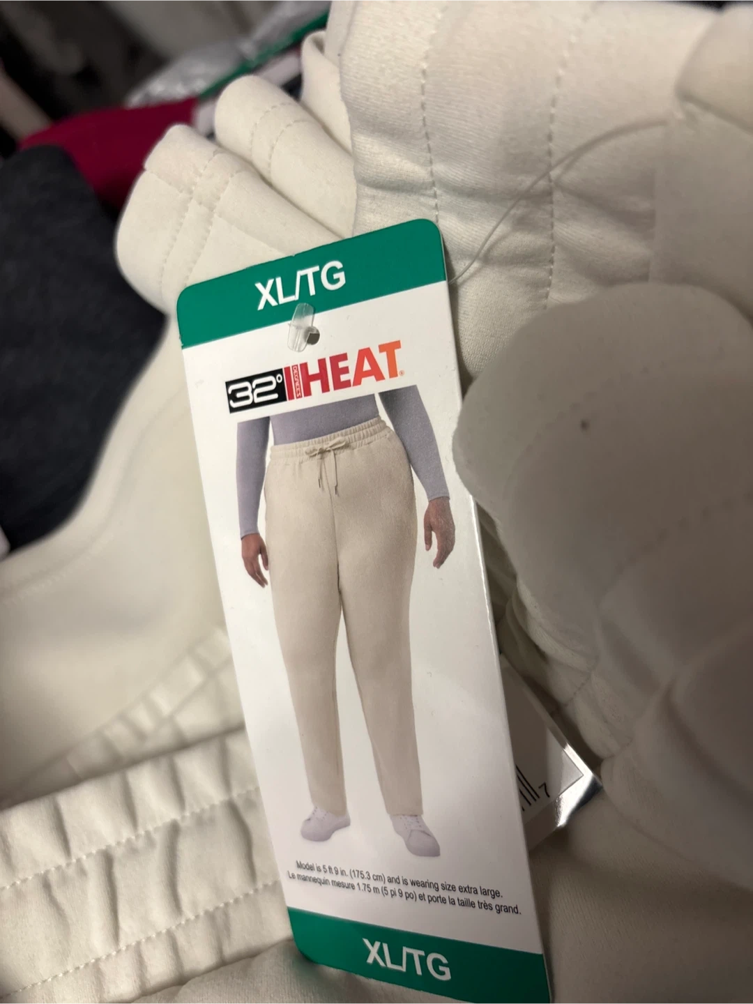 Bundle of four pairs of pants in size XL/TG. Includes Tuff Athletics leggings, 32° HEAT pants, Gaiam leggings, and Champion cargo pants. All are new with tags.