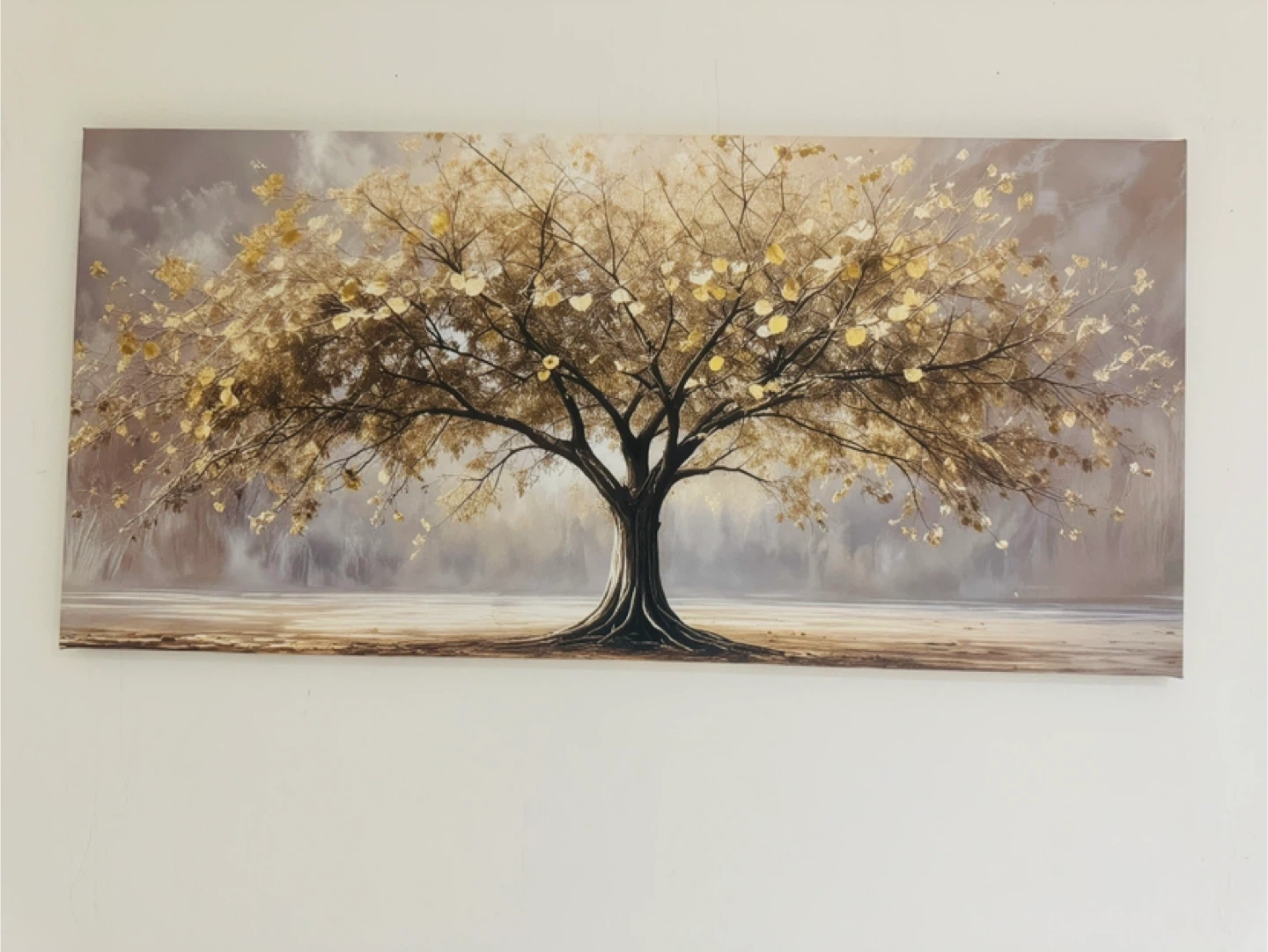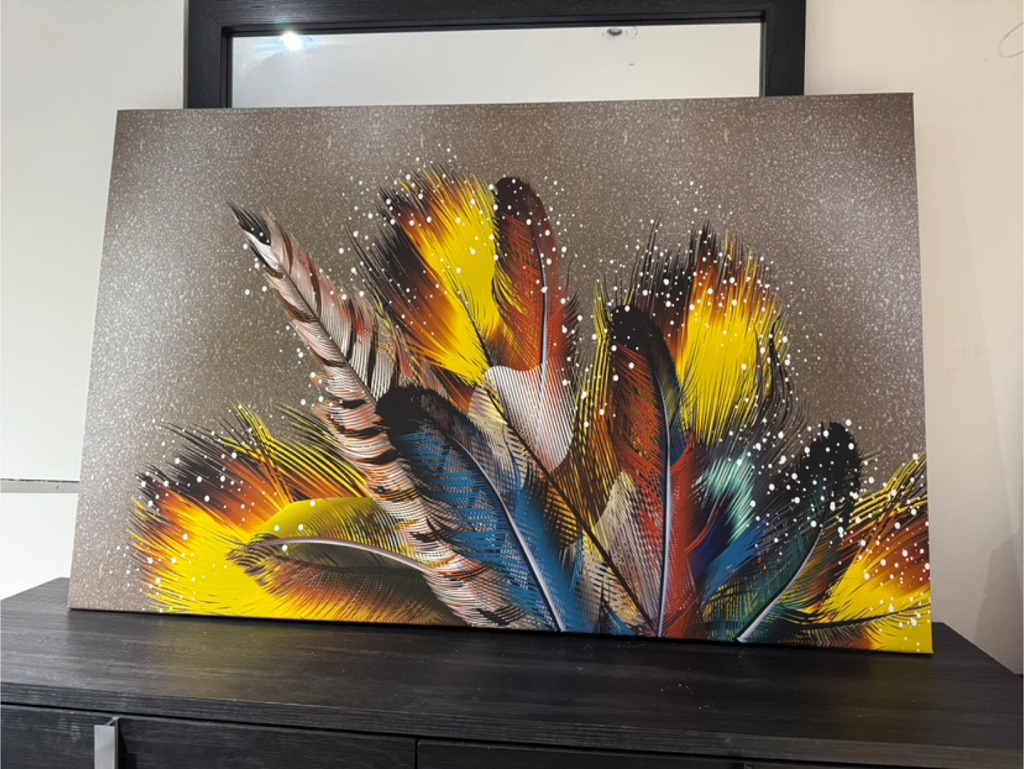 Beautiful canvas wall art featuring a vibrant sunset over the water with a boat. Another print showcases a serene mountain lake landscape at sunrise, reflecting the trees and sky. These pieces add a pop of colour and nature to any room!