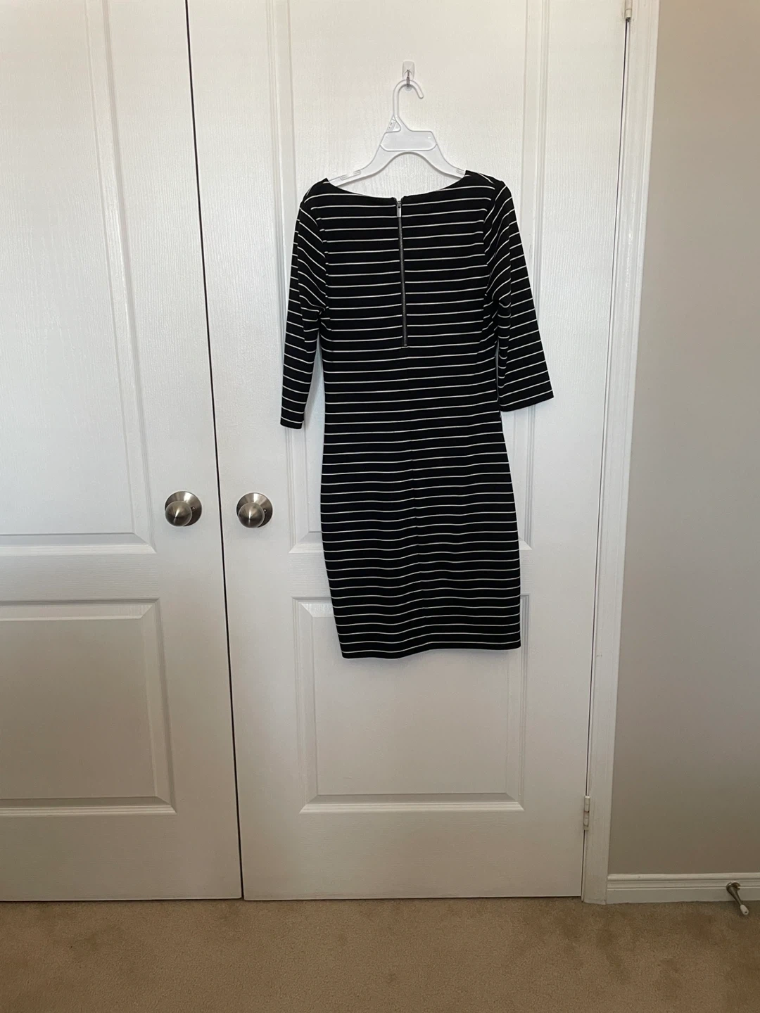 This Reitmans dress features a classic black and white stripe pattern. It has a V-neckline with a zippered closure at the back. The dress is size XS.
