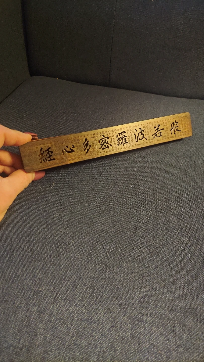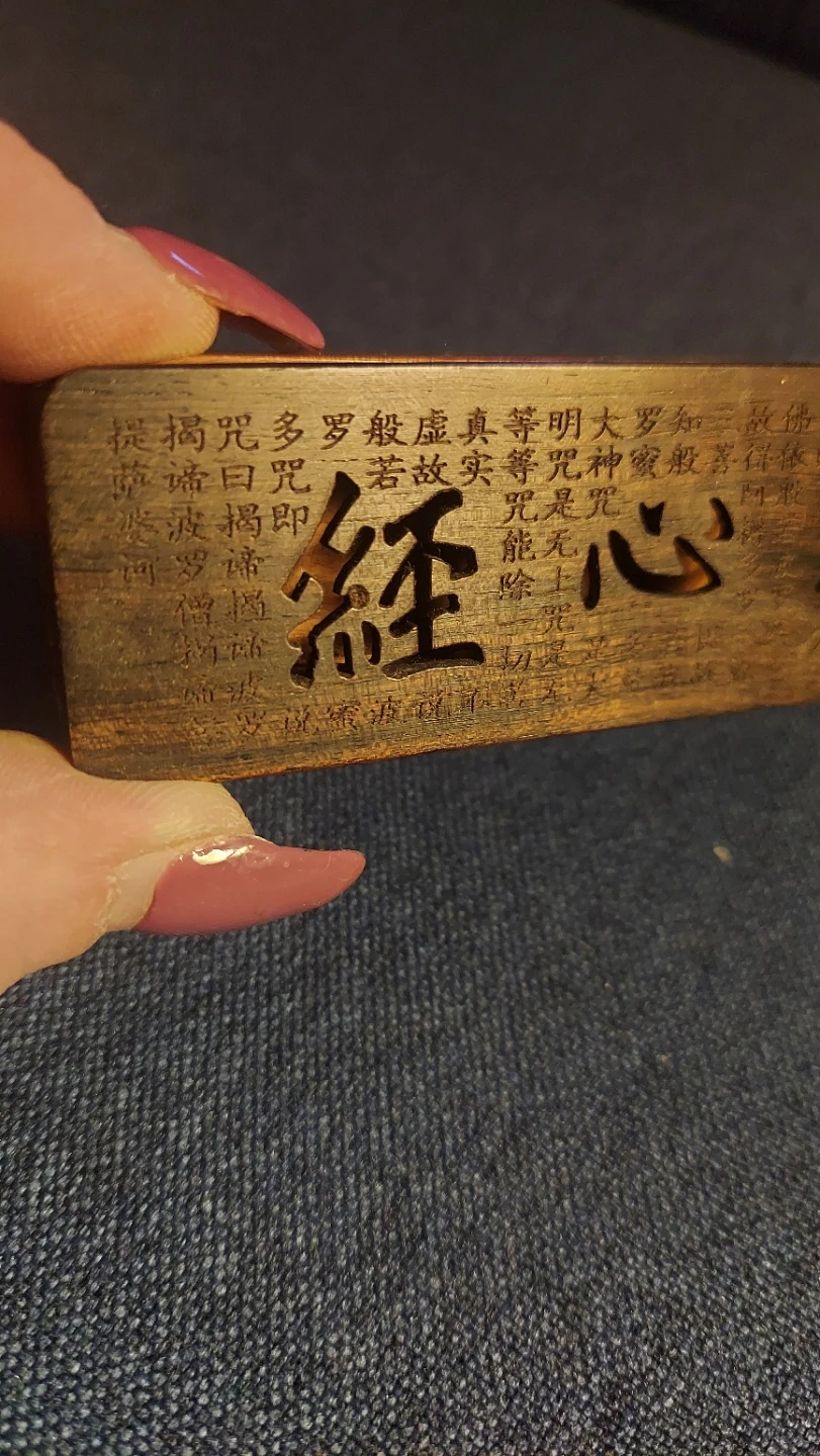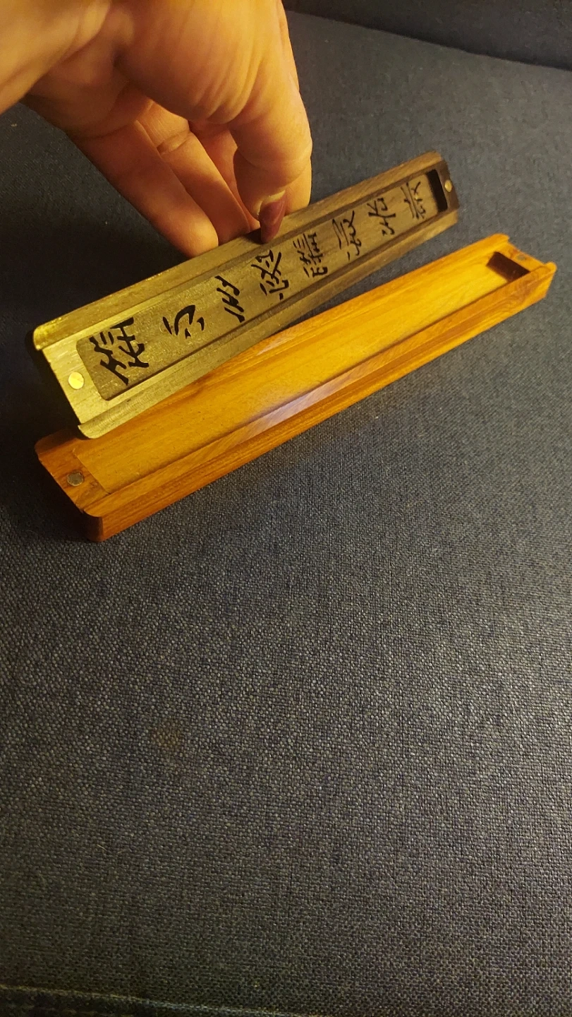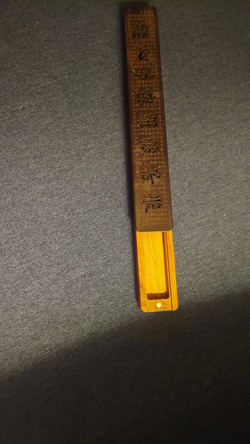 Vintage wooden box with intricate Chinese characters carved into dark wood, slightly distressed for decorative purposes. Made for burning stick incense, or storage!
