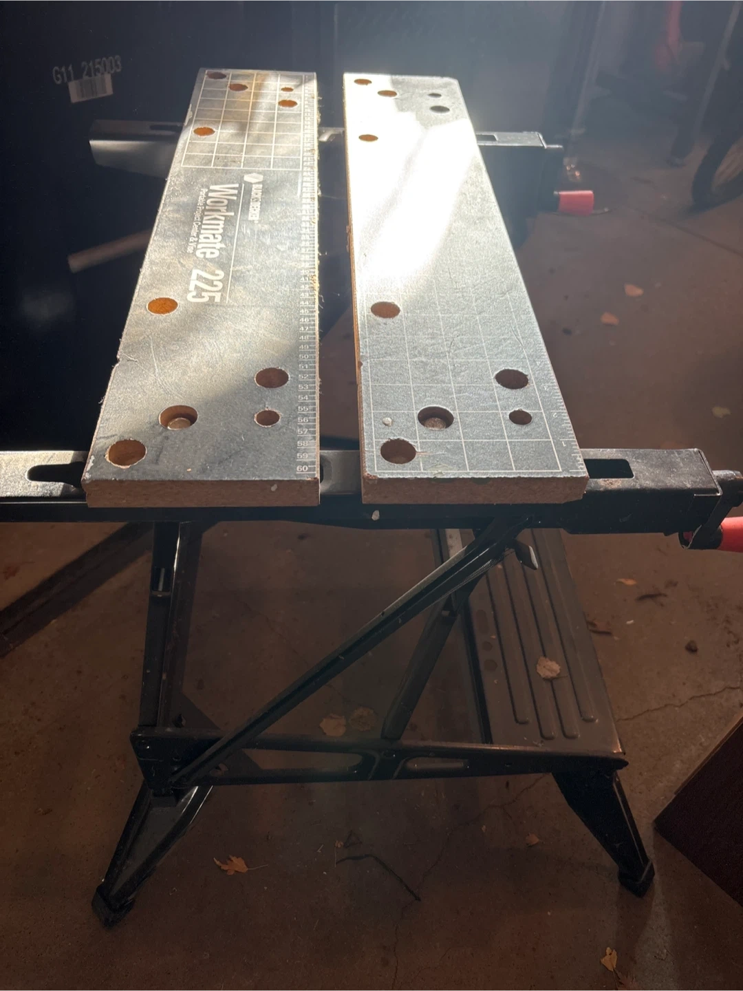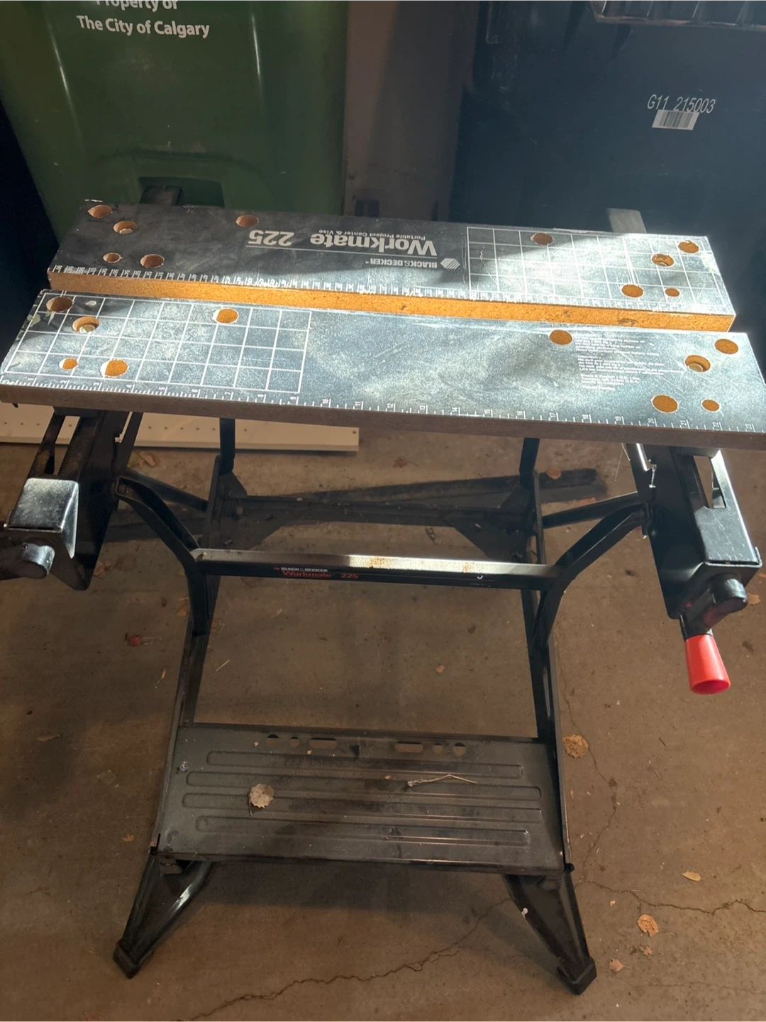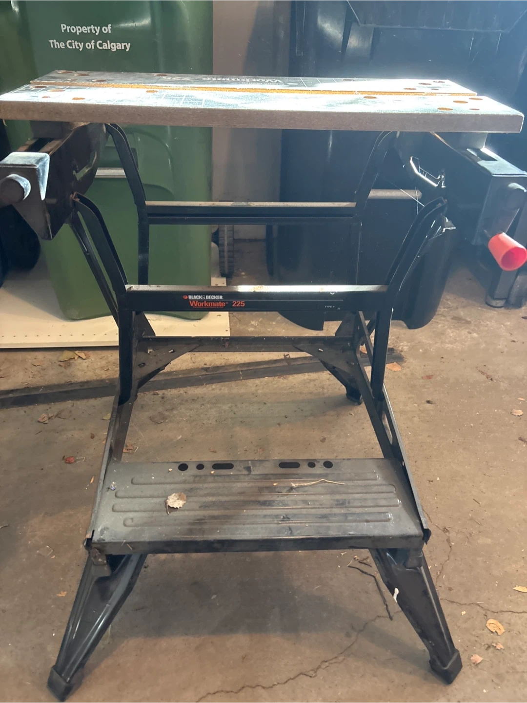 This is a BLACK+DECKER Workmate 225 portable work bench. It's a folding sawhorse with a vise feature. Measures 79cm high, 60cm wide, and 68cm deep when open.