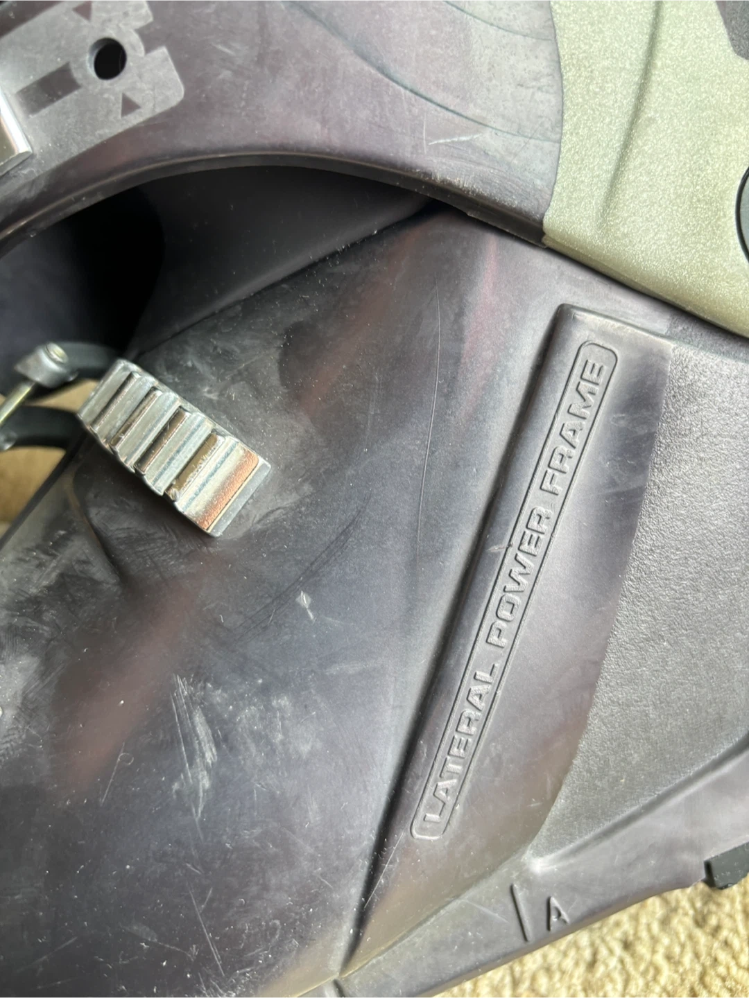 Women's Salomon AXE ski boots with a 284mm sole length. Size 38, US women's 6.5. Features lateral power frame technology. They have a Supermax Powerpack therm-ic system. They show some signs of wear.