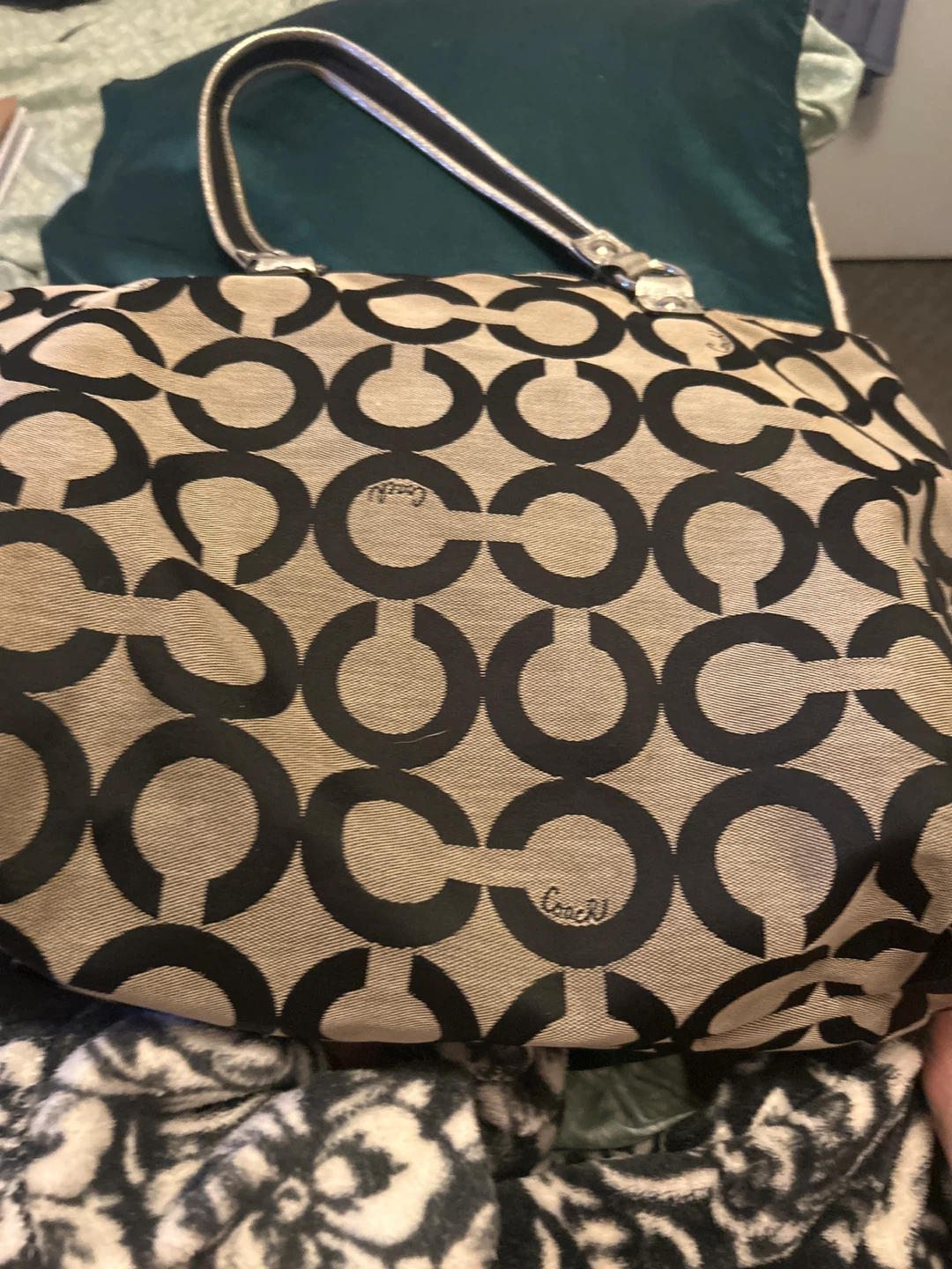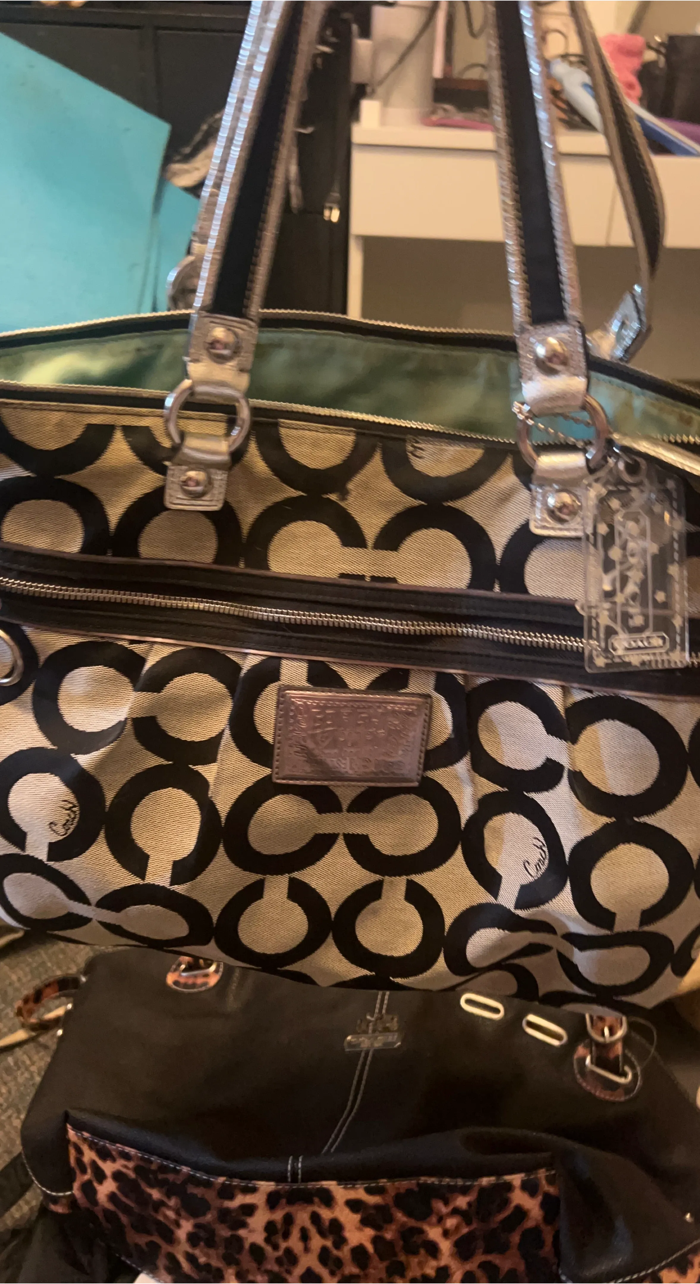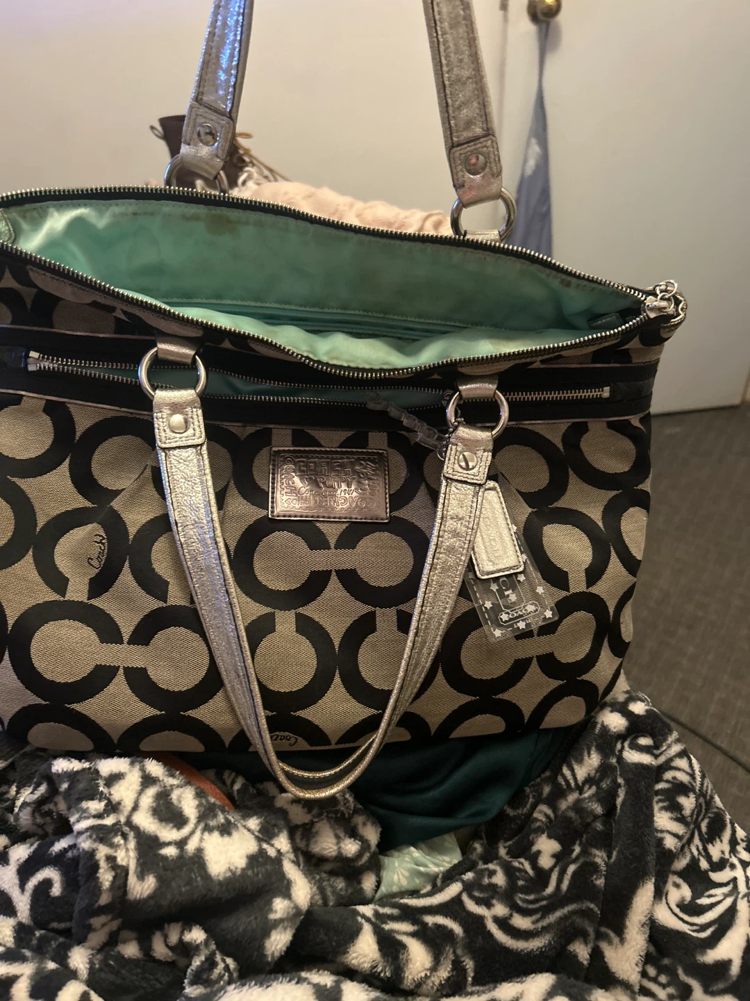 Classic Coach tote bag featuring the signature "C" pattern. It has a zip-top closure and dual straps. Interior lining is a light green colour.