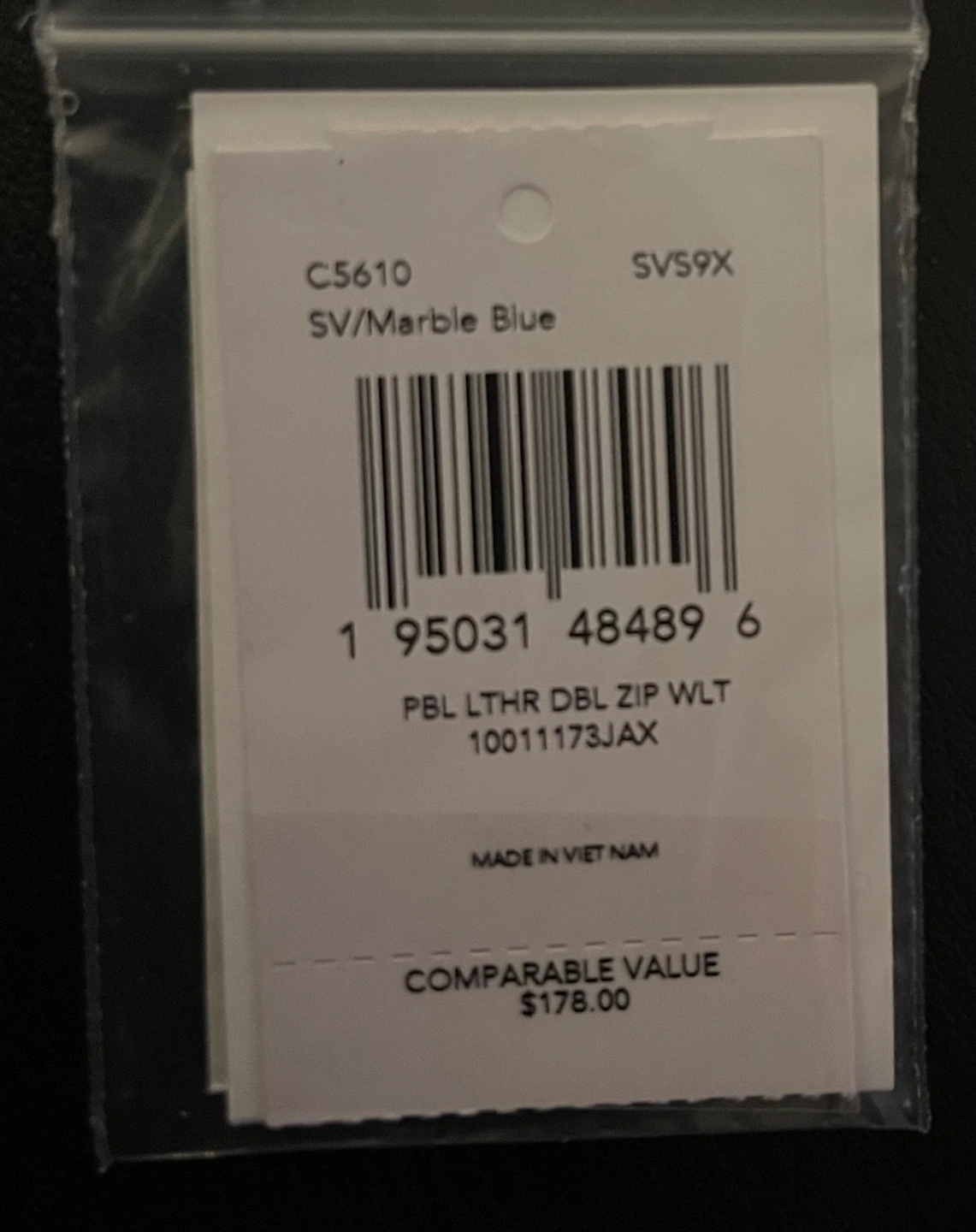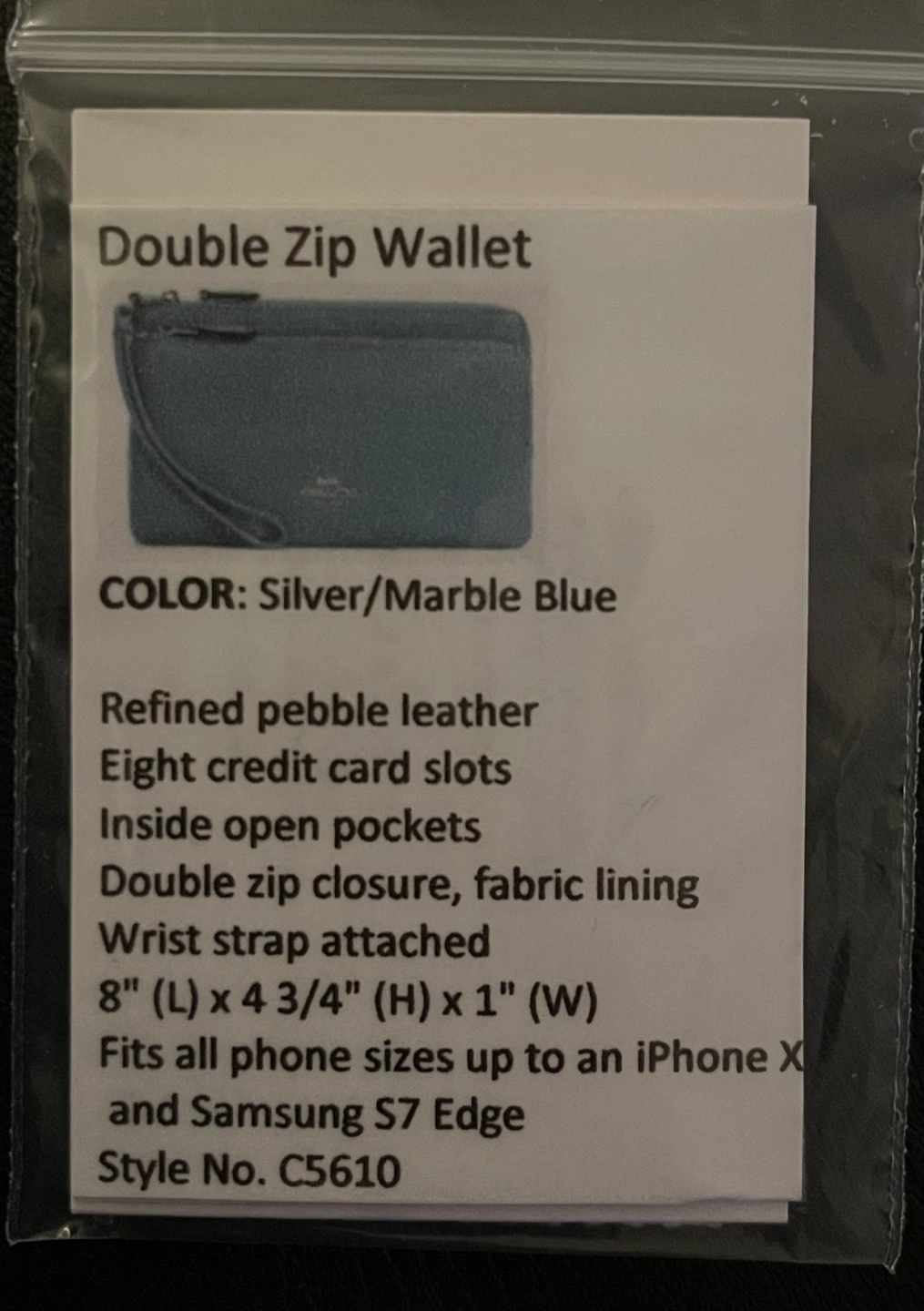Pebble leather double zip wallet. Eight credit card slots. Inside open pockets. Wrist strap. Fits iPhone X and Samsung S7 Edge. Silver/Marble Blue.