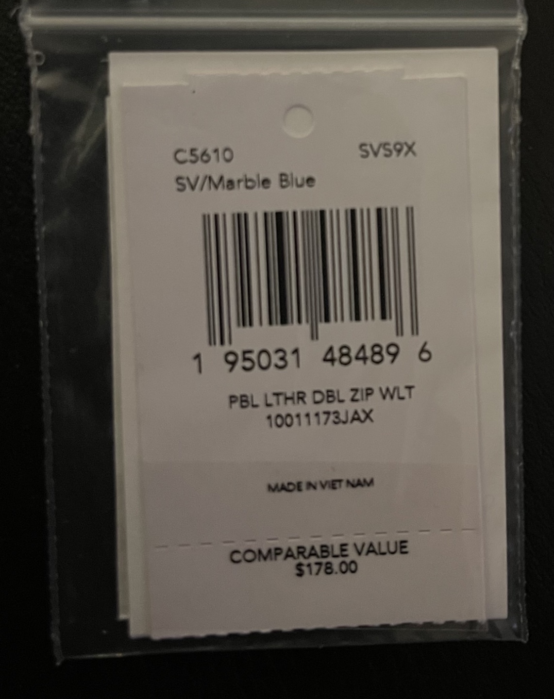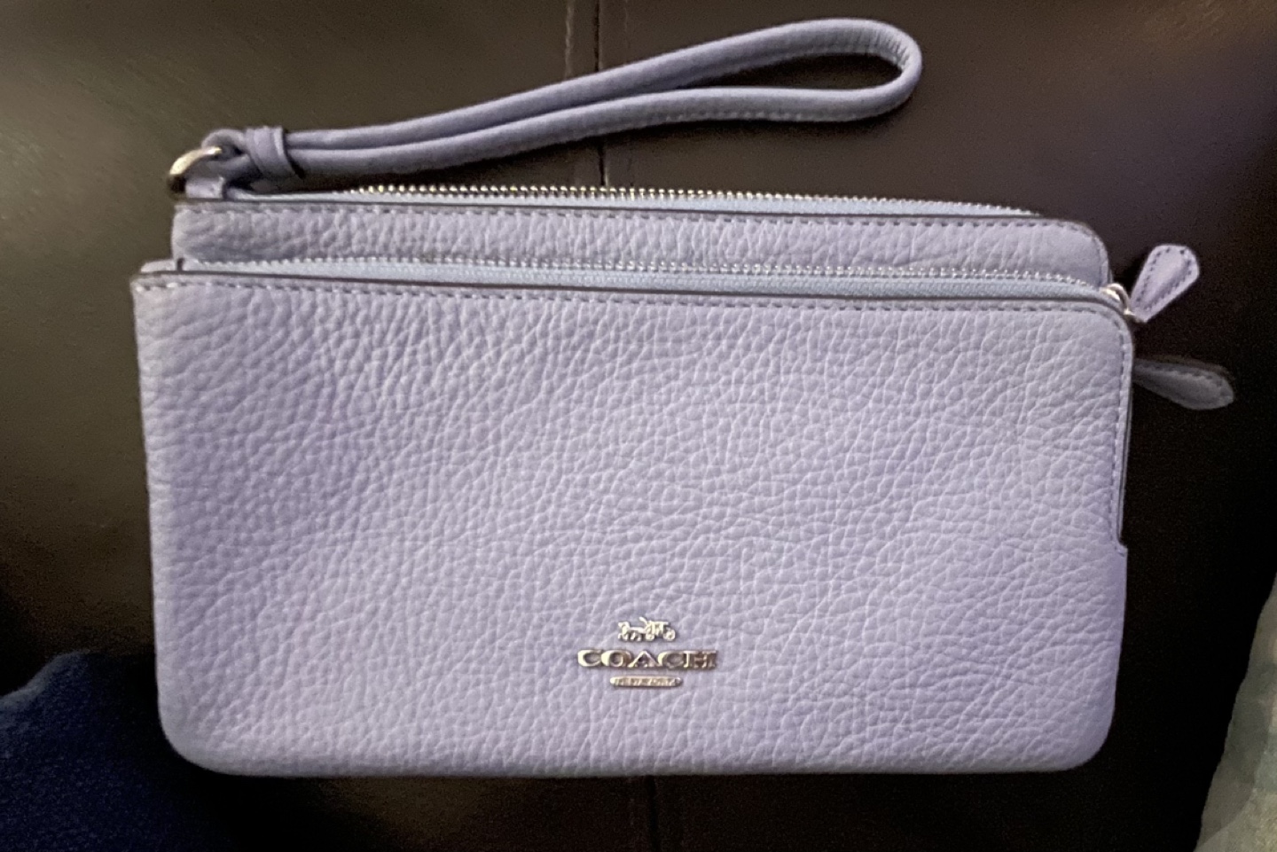 Pebble leather double zip wallet. Eight credit card slots. Inside open pockets. Wrist strap. Fits iPhone X and Samsung S7 Edge. Silver/Marble Blue.