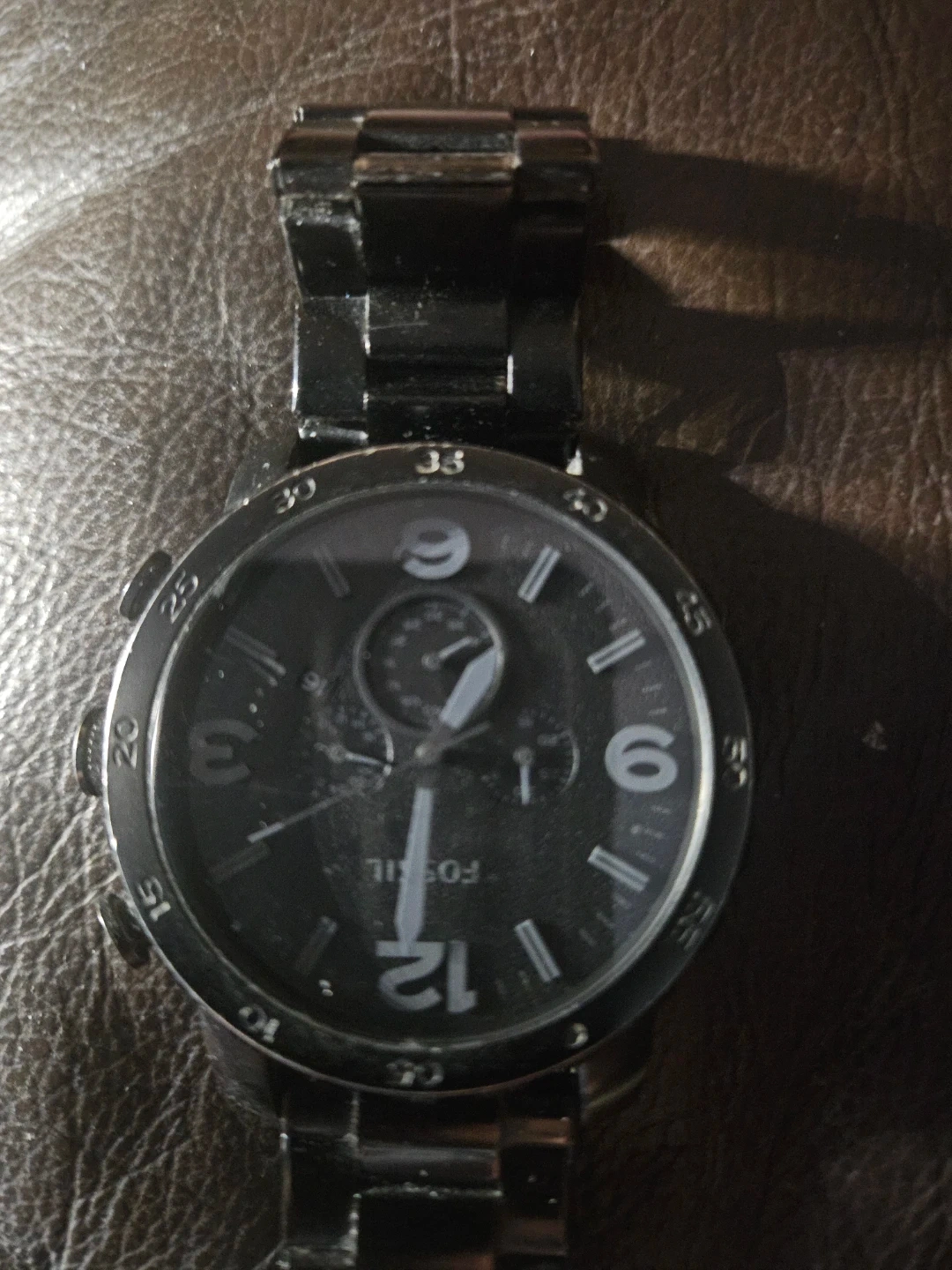 Selling a Fossil men's watch. It has a black metal band and face. It's in good condition, ready for a new wrist has a little scratch.