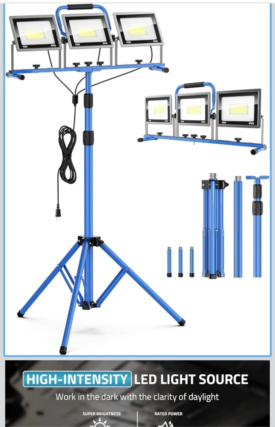 High-intensity LED work light with a blue tripod stand. Features three adjustable light heads and IP66 rating. Perfect for illuminating dark workspaces. It has a super brightness output. Brand New