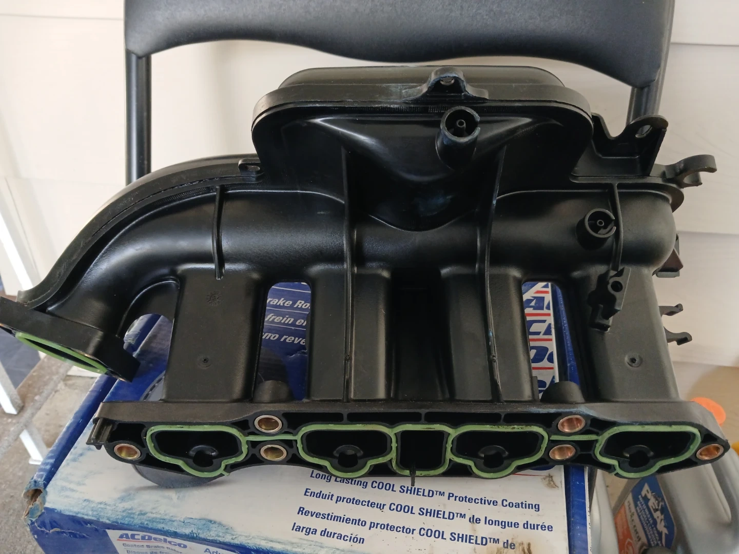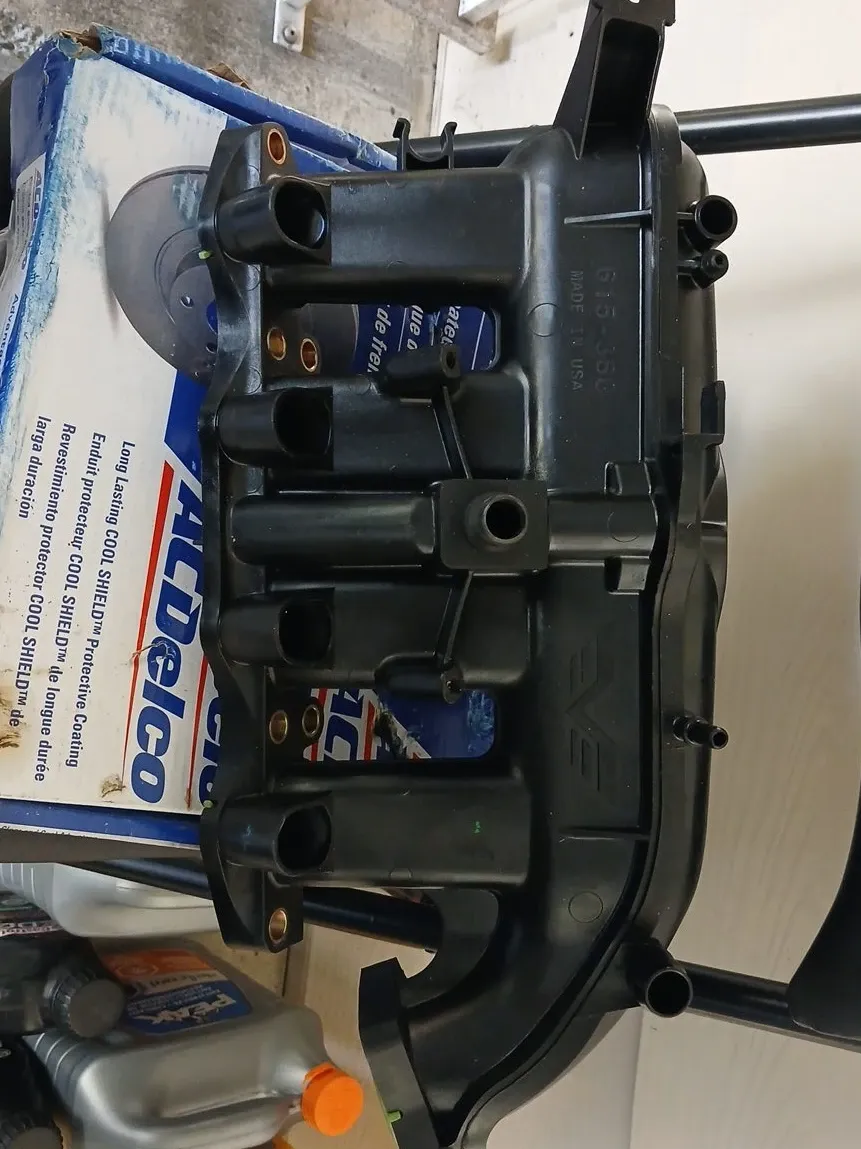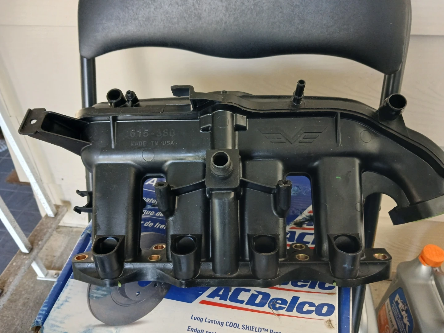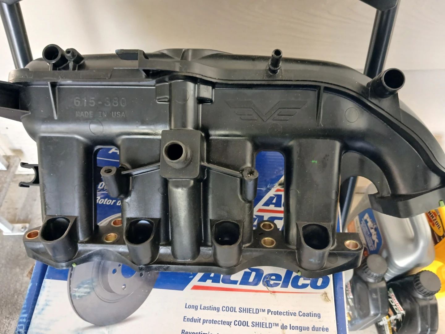 This is an ACDelco intake manifold, part number 615-380. It's made in the USA. This part is black plastic and comes with gaskets. It has a protective coating.