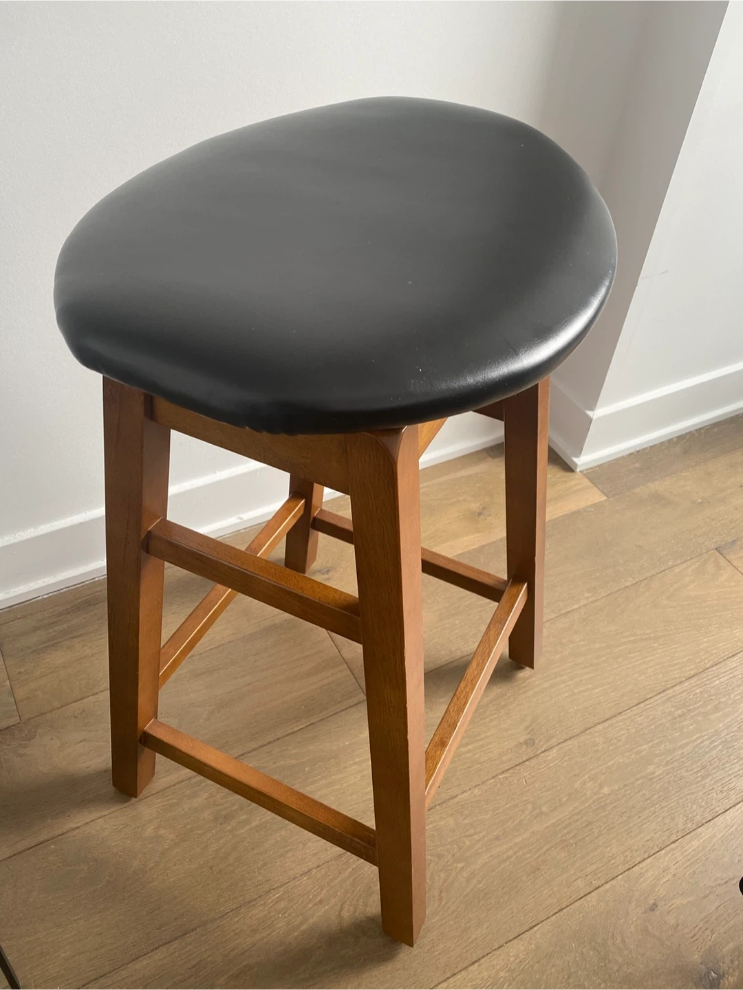 This bar stool features a sturdy wooden frame with a comfortable black cushioned seat. Its simple design makes it a versatile addition to any kitchen island or bar area. The wood has a warm, natural finish.