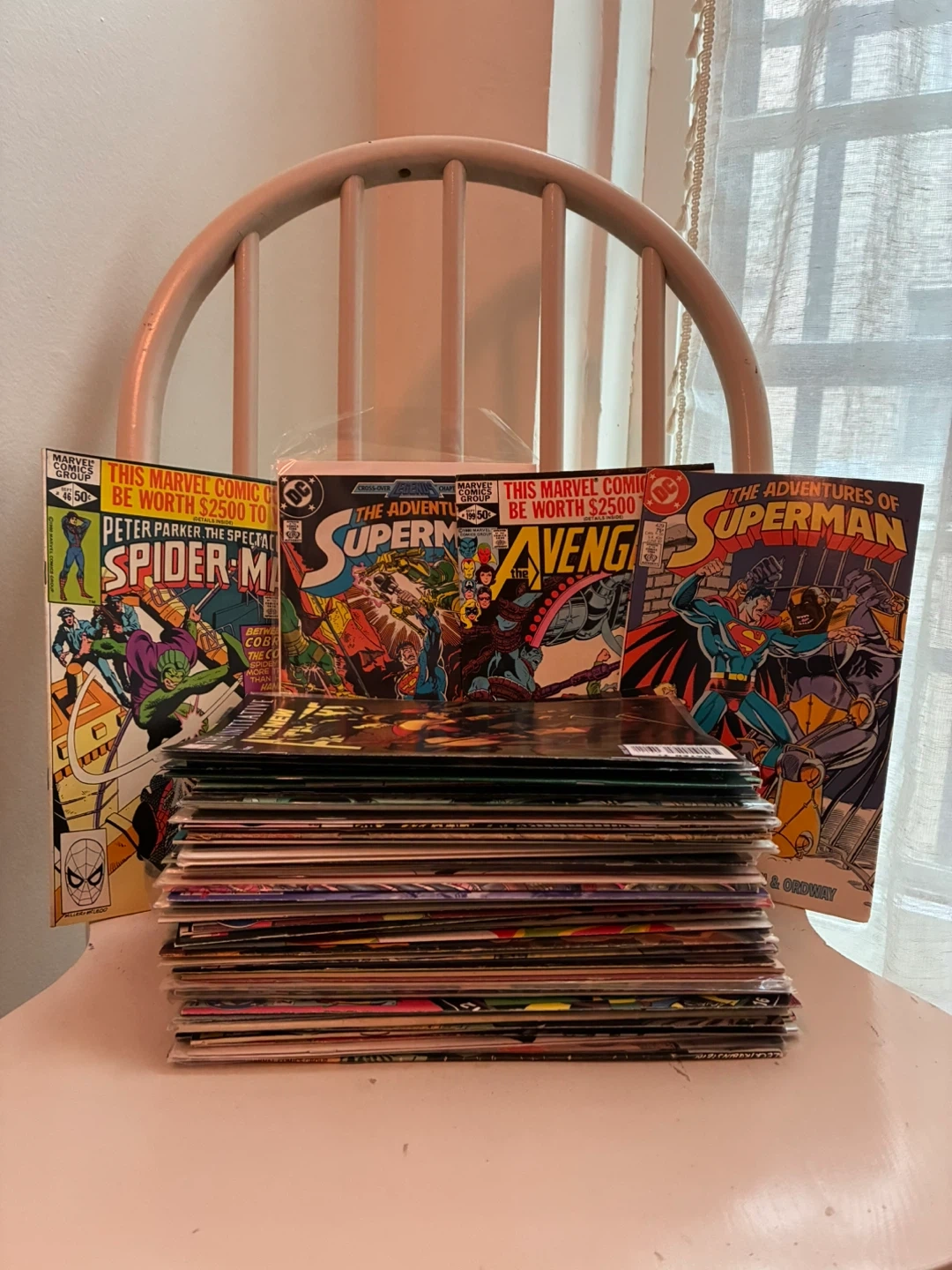 Collection of assorted Marvel and DC comic books. Includes titles like Spider-Man, Avengers, Superman, and Justice League. Pages are intact and covers are in good condition.