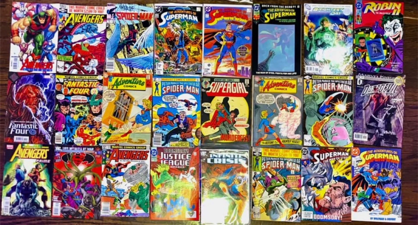 Collection of assorted Marvel and DC comic books. Includes titles like Spider-Man, Avengers, Superman, and Justice League. Pages are intact and covers are in good condition.