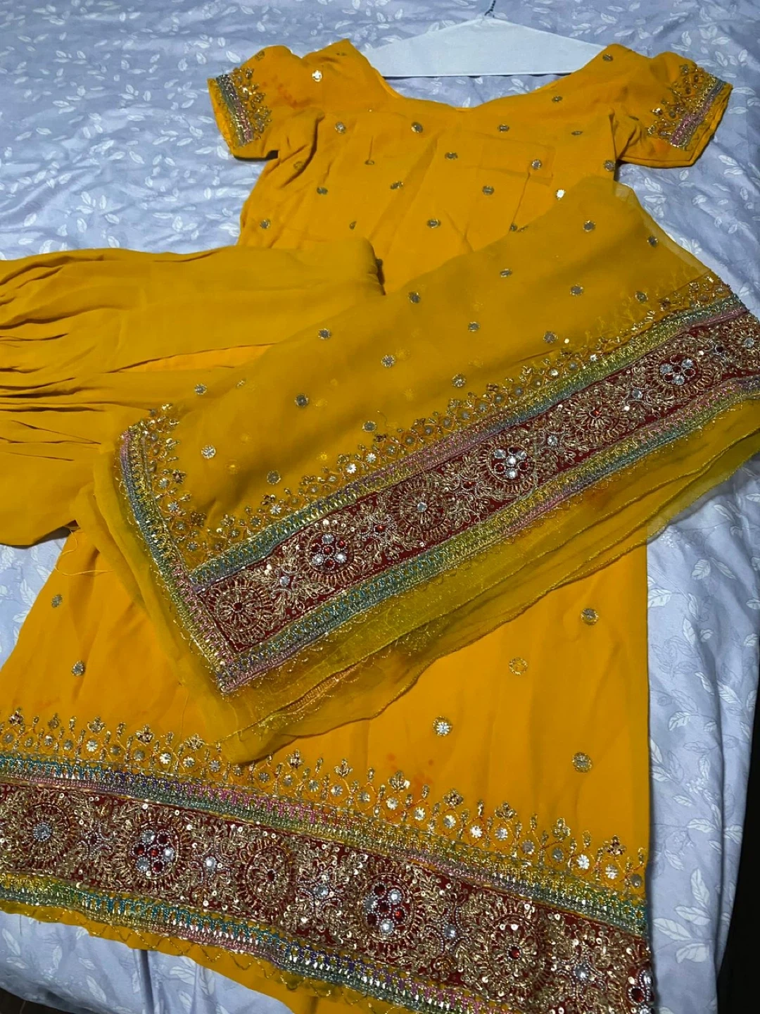 This is a stunning yellow kurti set with intricate embellishments. It features a kurti with short sleeves and a matching dupatta and shalwar. The set is adorned with detailed embroidery, sequins, and beadwork along the borders and sleeves. It's perfect for festive occasions or cultural events! Dry cleaned.