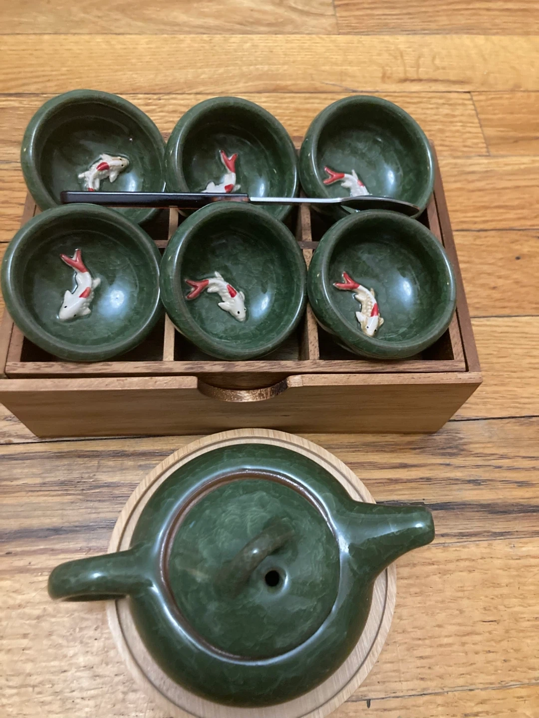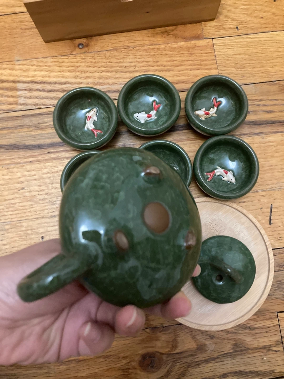 Pickup and cash only. This set includes a green ceramic teapot and six matching cups. Each cup features a detailed koi fish design inside. The teapot has a lid and a handle, and the set rests on a wooden tray. It's a beautiful addition for any tea lover!
