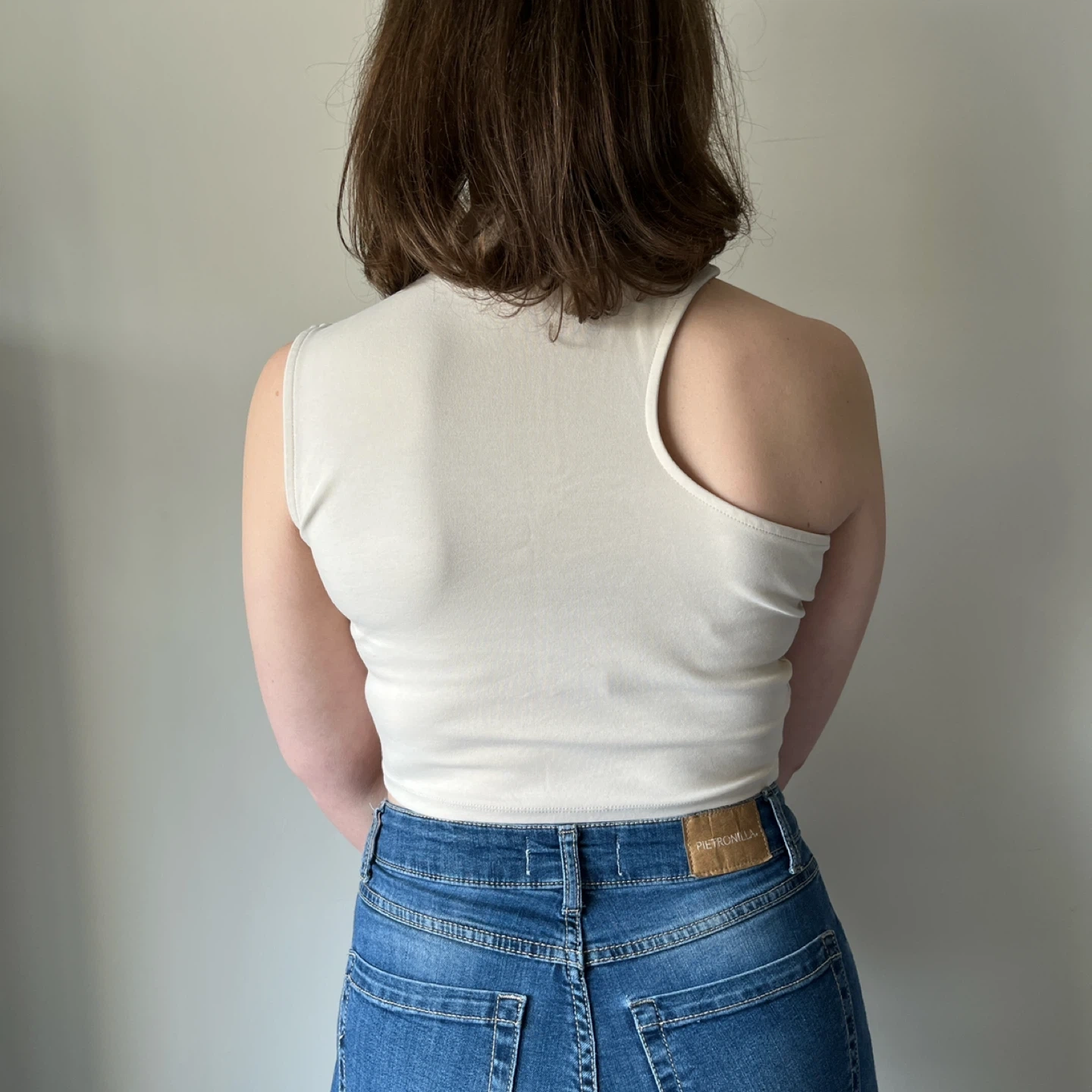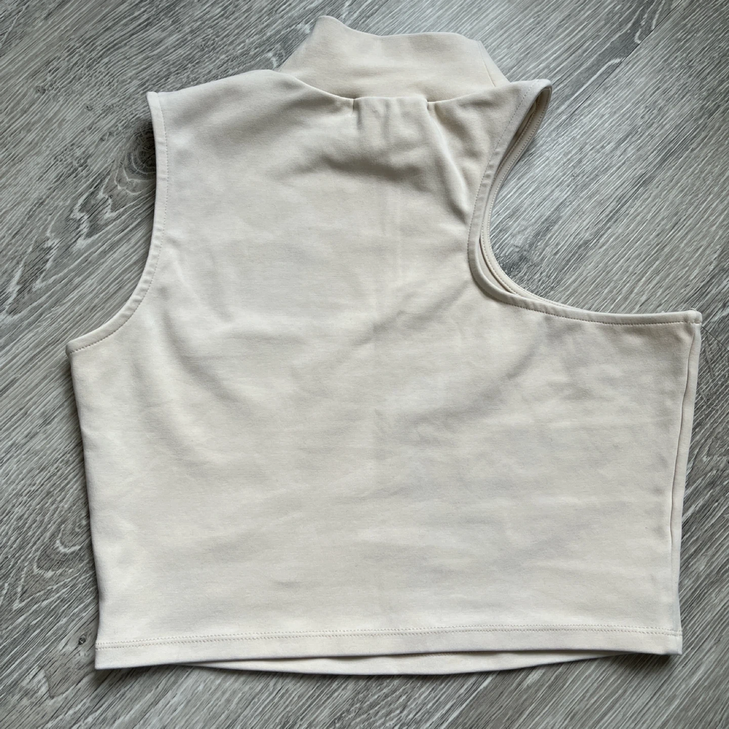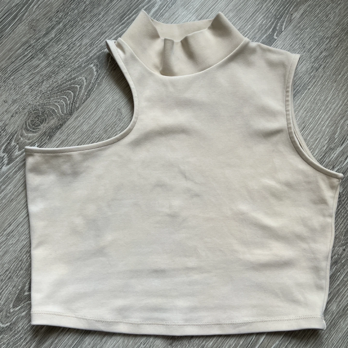 Oak + Fort cream coloured sleeveless crop top with a mock neck and a shoulder cut-out.