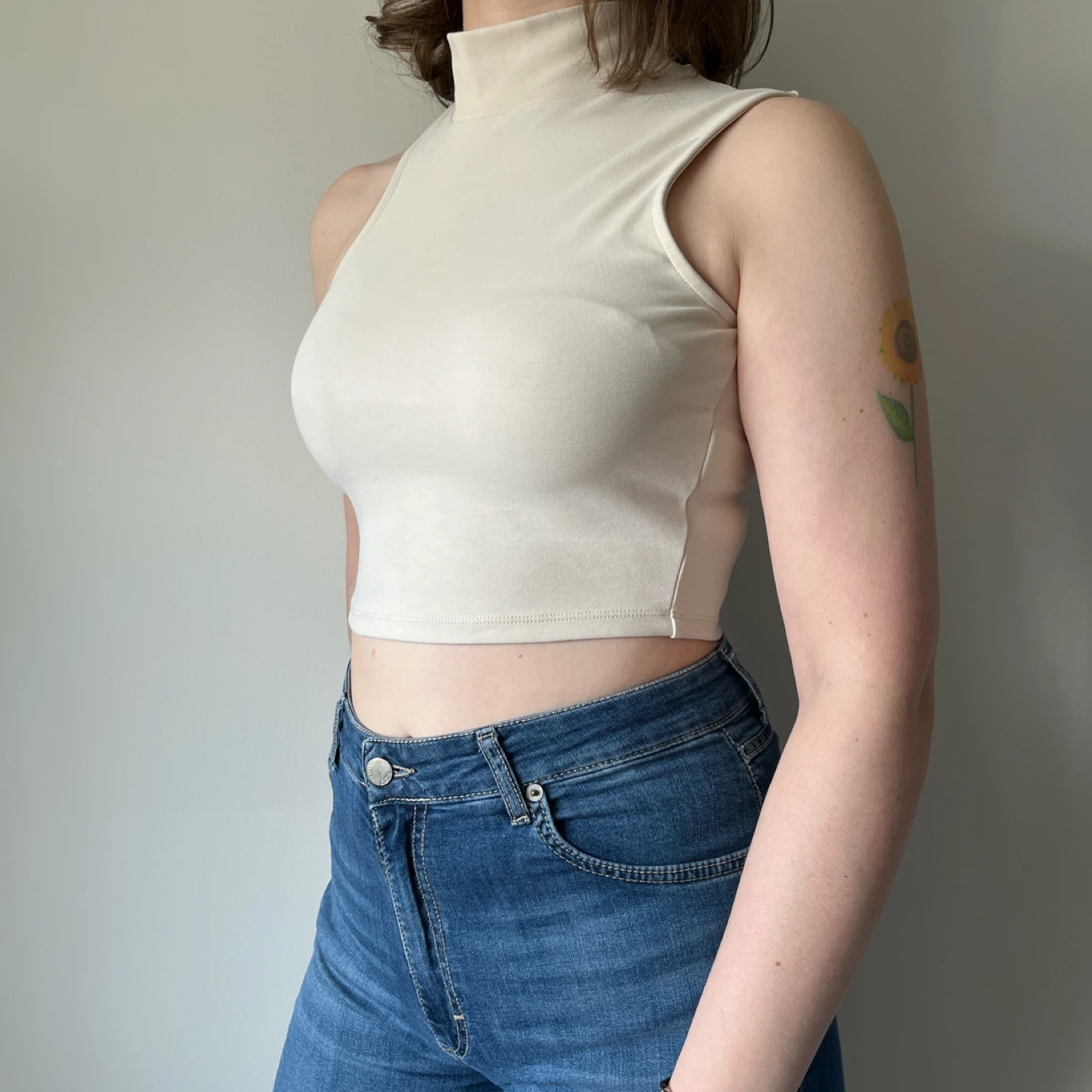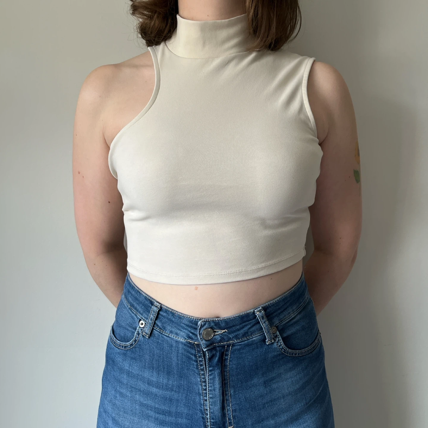 Oak + Fort cream coloured sleeveless crop top with a mock neck and a shoulder cut-out.