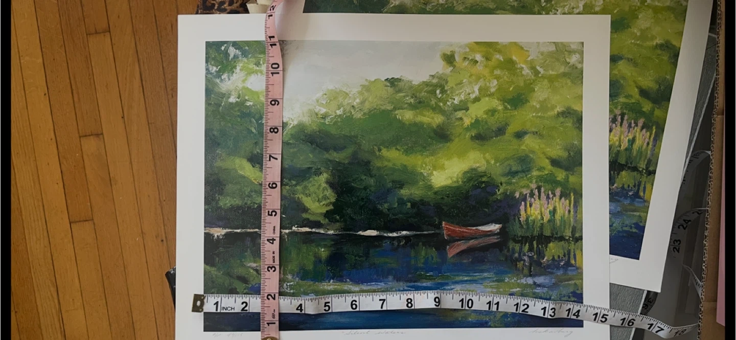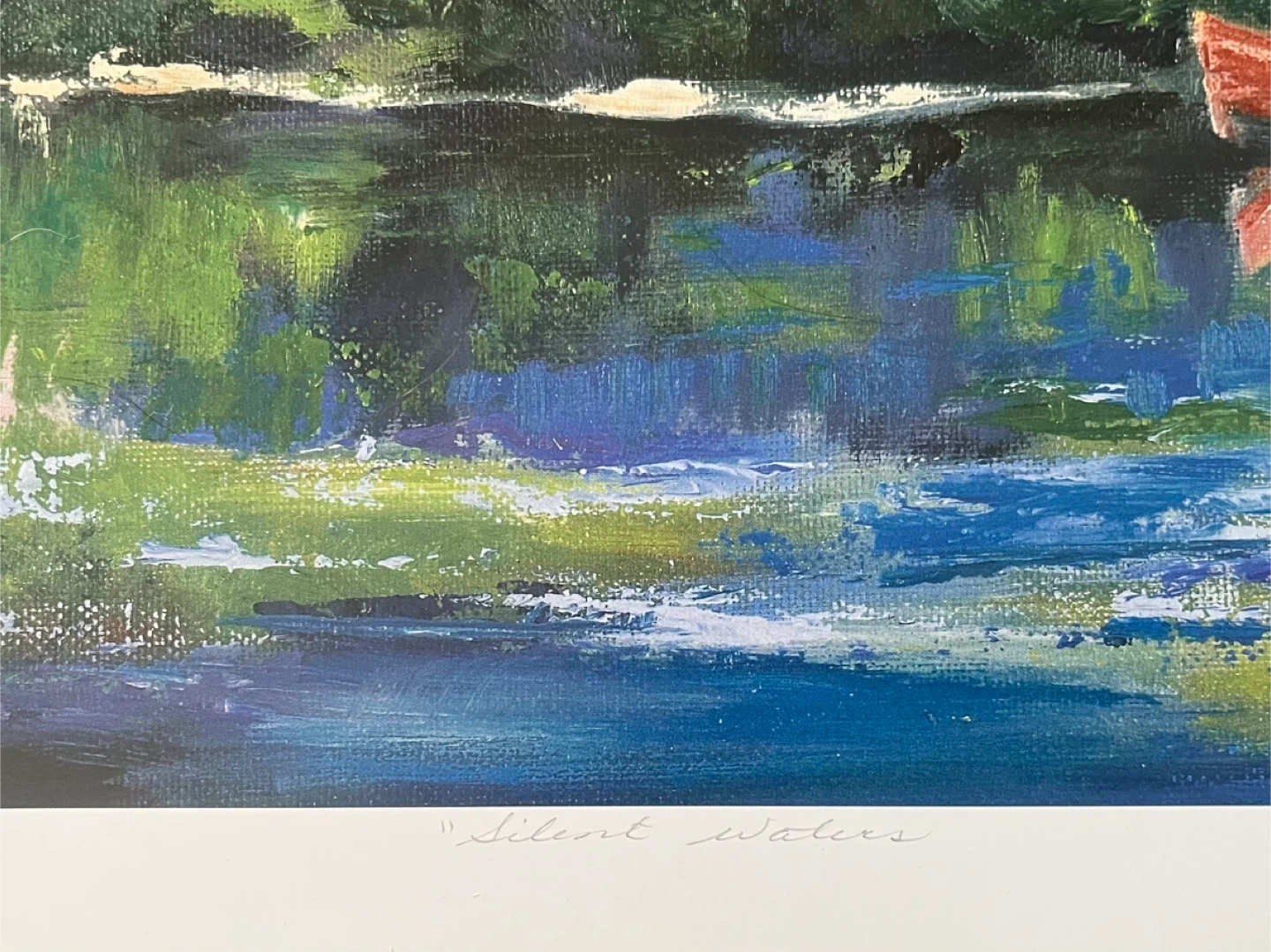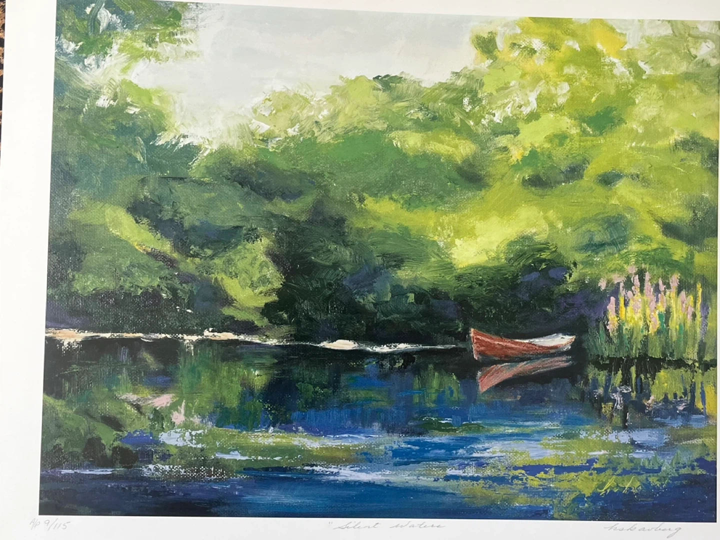 This is a print of the "Silent Waters" painting by Calgary artist Hazel Scavberg. It features a red boat on a lake surrounded by lush greenery.