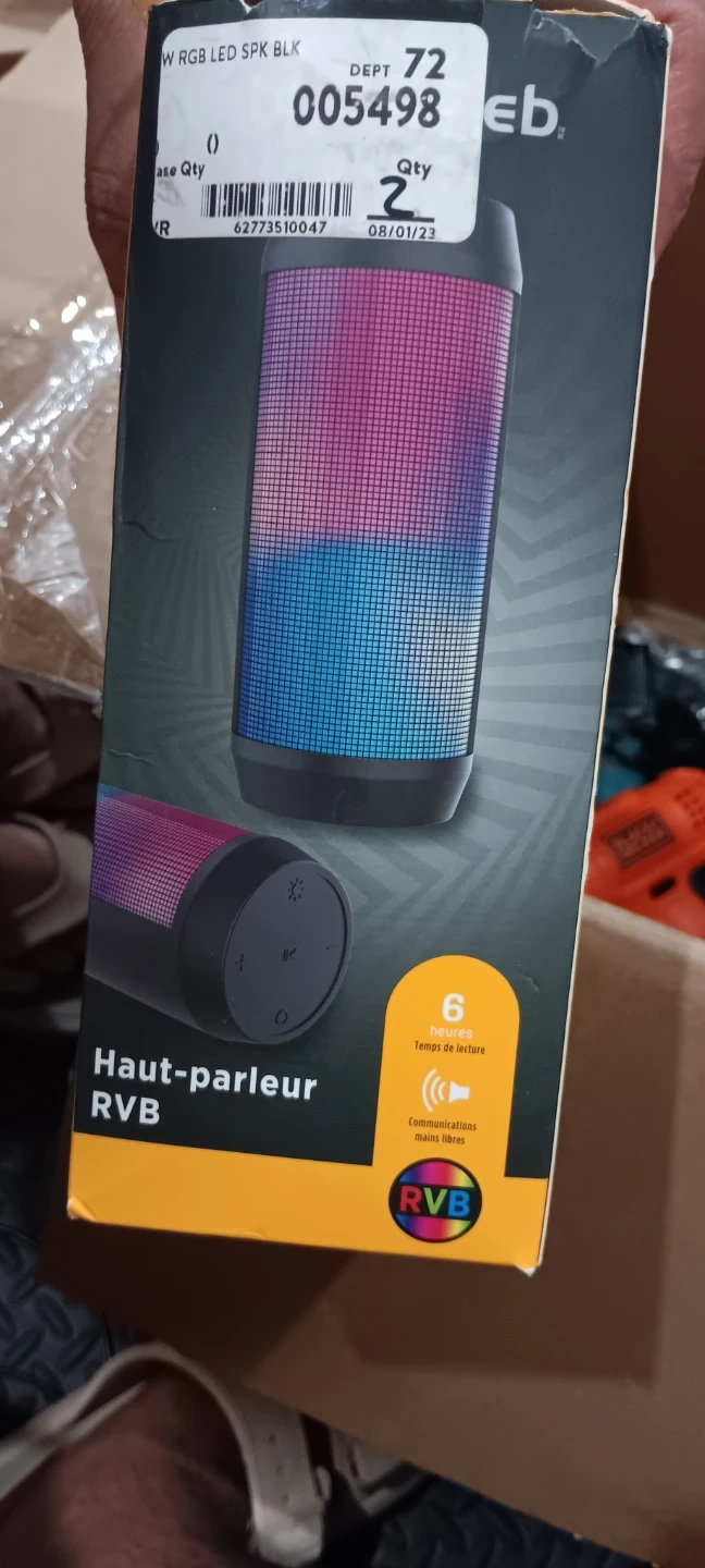Selling a Web RGB LED speaker in black. The box indicates it has a 6-hour battery life. It also features RVB (multi-coloured) communications. Comes with Haut-parleur RVB.