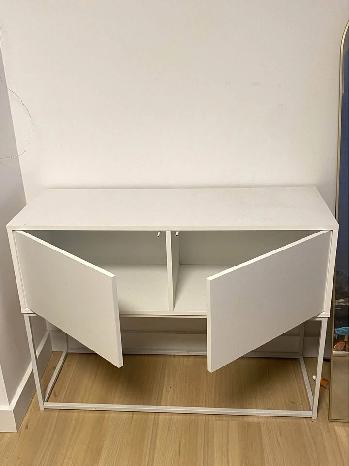 Moving out so need this to go ASAP. The cabinet was brought from Urban Outfitters, still very sturdy and clean. No scratches at all on the surface as well as the inside. The little thing to open/close the door inside one cabinet was broken when I assembled, but I fixed it by gluing and it works totally fine even until now.