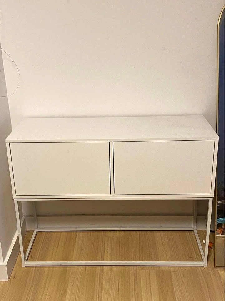 Moving out so need this to go ASAP. The cabinet was brought from Urban Outfitters, still very sturdy and clean. No scratches at all on the surface as well as the inside. The little thing to open/close the door inside one cabinet was broken when I assembled, but I fixed it by gluing and it works totally fine even until now.