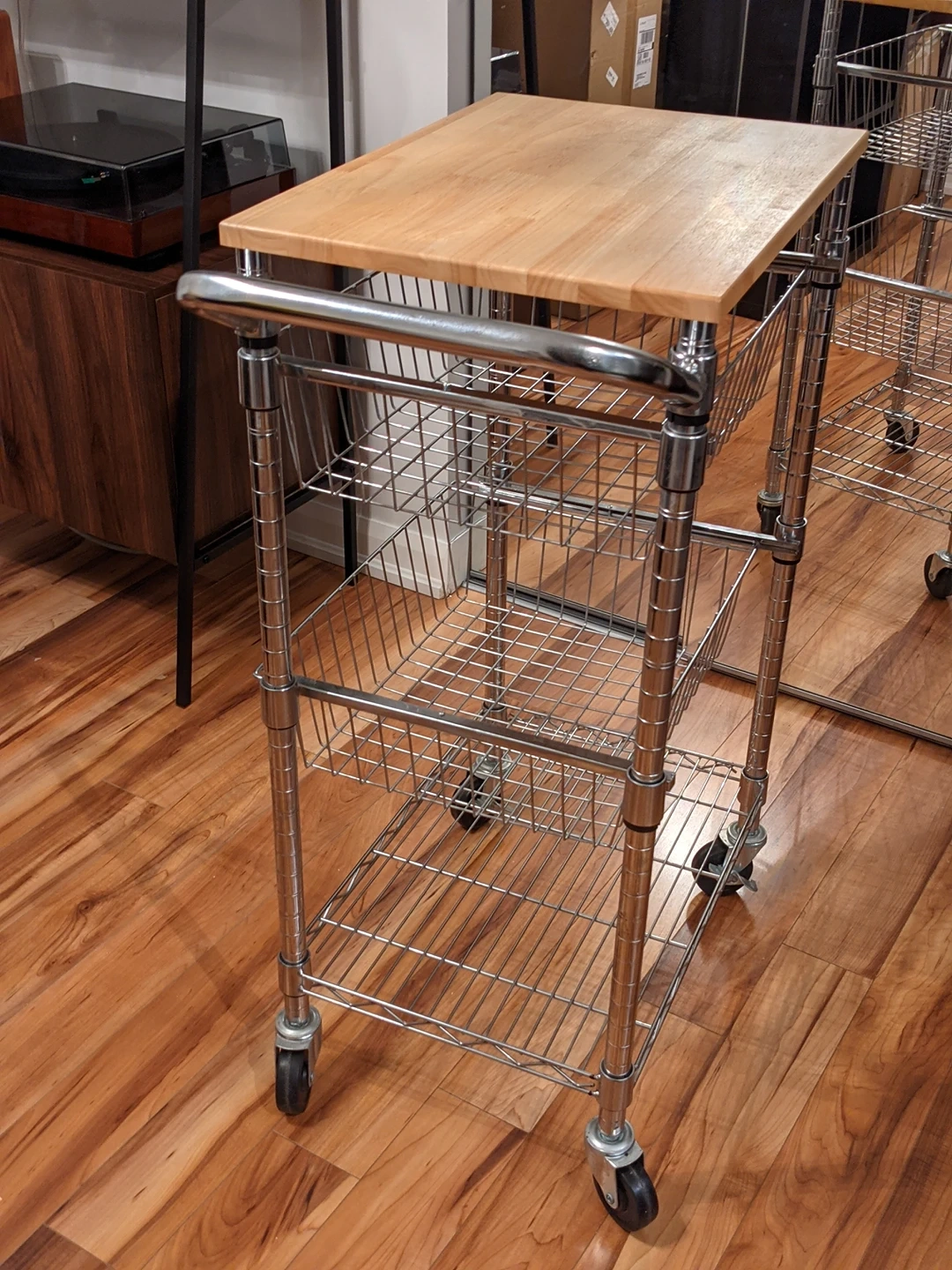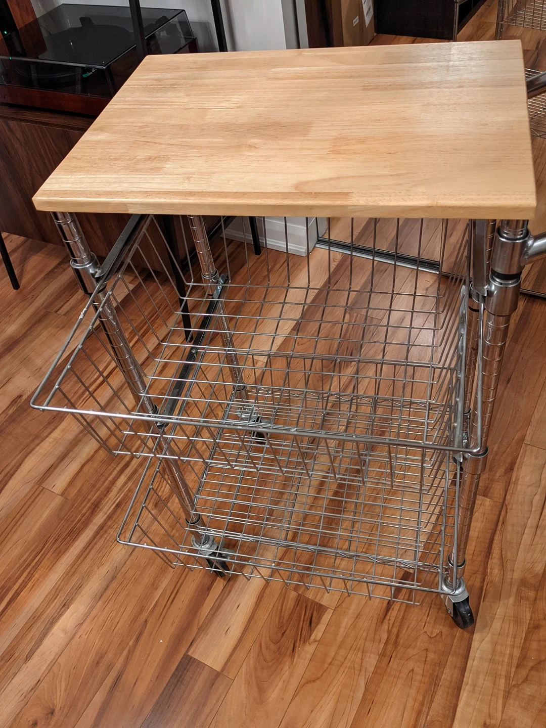 Kitchen pantry cart in mint condition. The top of the cart is a wood which can be used as a chopping board. I've never used it for that to avoid any damage. The top two shelves are drawers that can be pulled out. It's been a huge help to me for the past 3 years. I've recently moved to a new place with a larger kitchen so I don't need a separate pantry. Hoping that someone else can put it to good use.