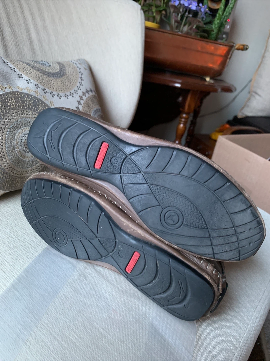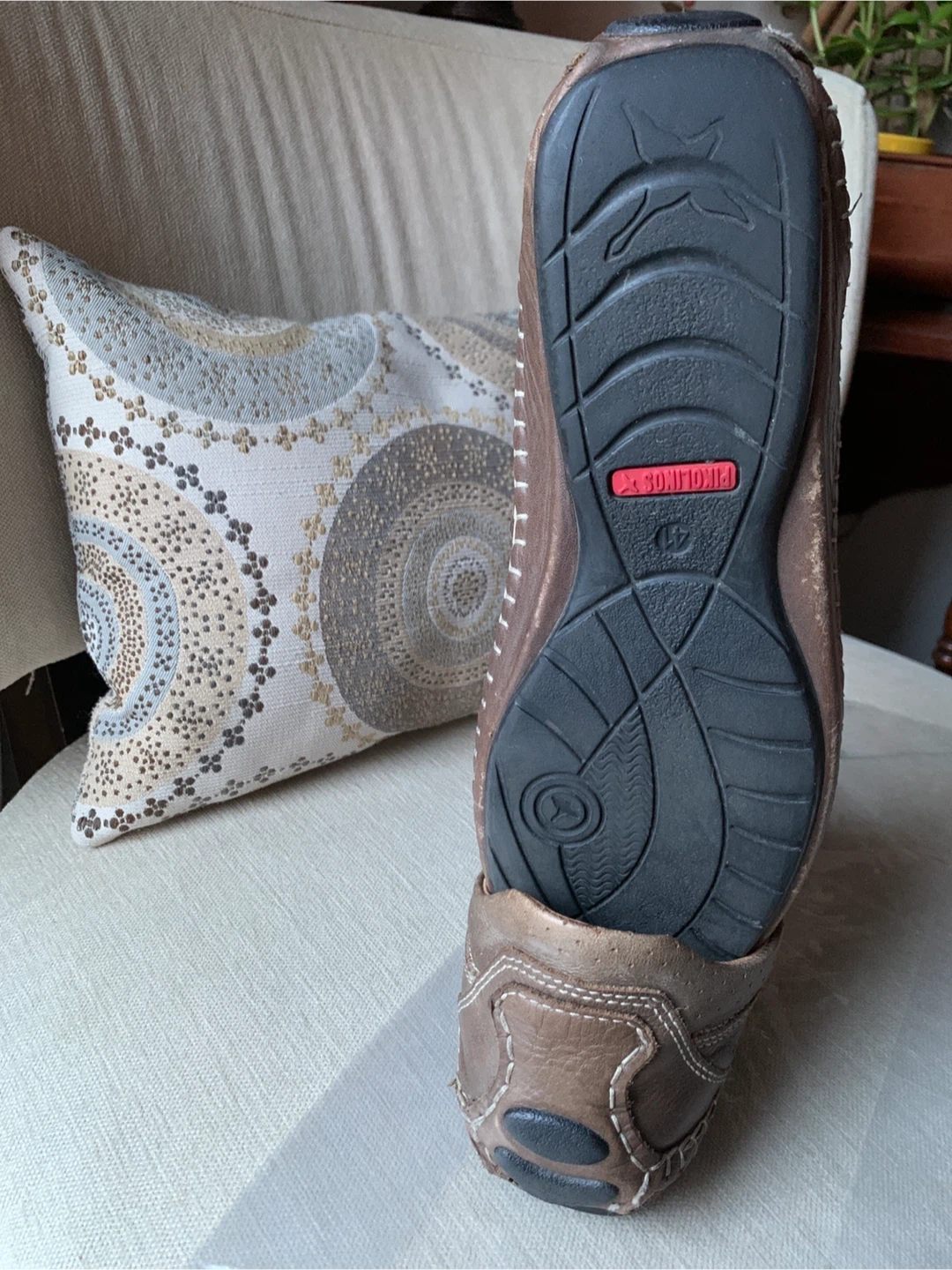 These brown Pikolinos shoes are made of genuine leather. They feature a comfortable driving shoe style with classic stitching. Size 41.