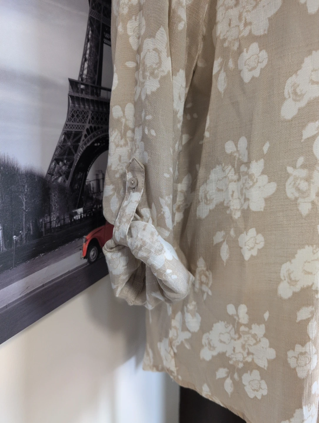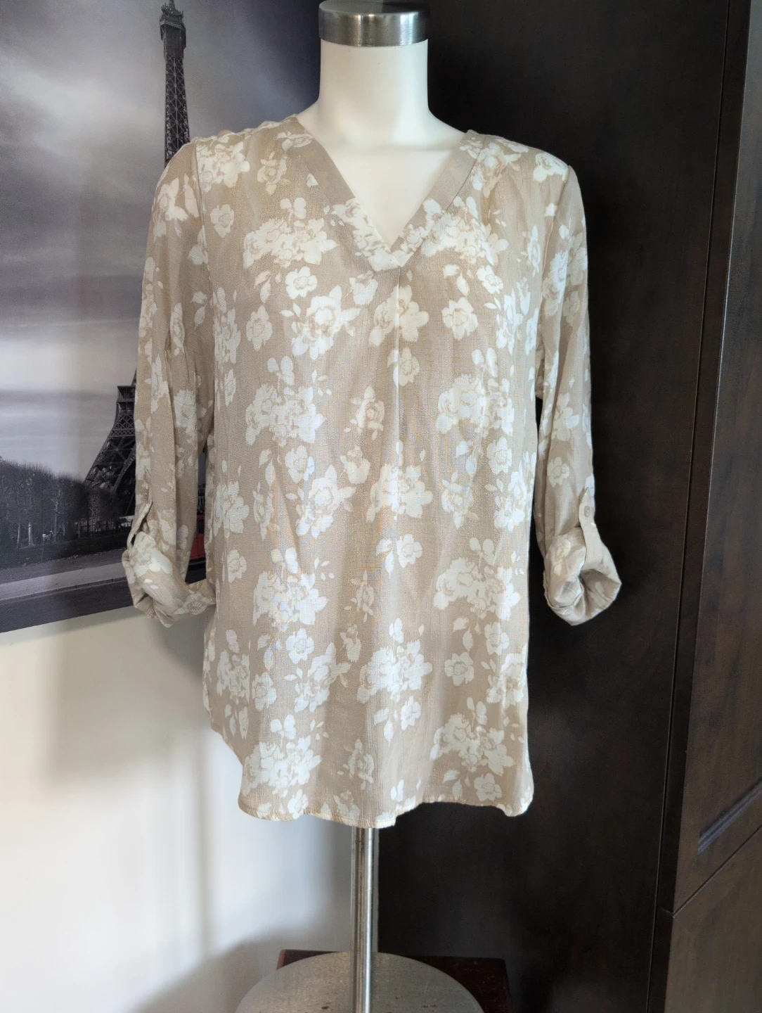 Lightweight beige top with a delicate white floral print. It features a V-neck and roll-tab sleeves for a casual look. Size 10. This top's breezy material makes it perfect for warmer days.