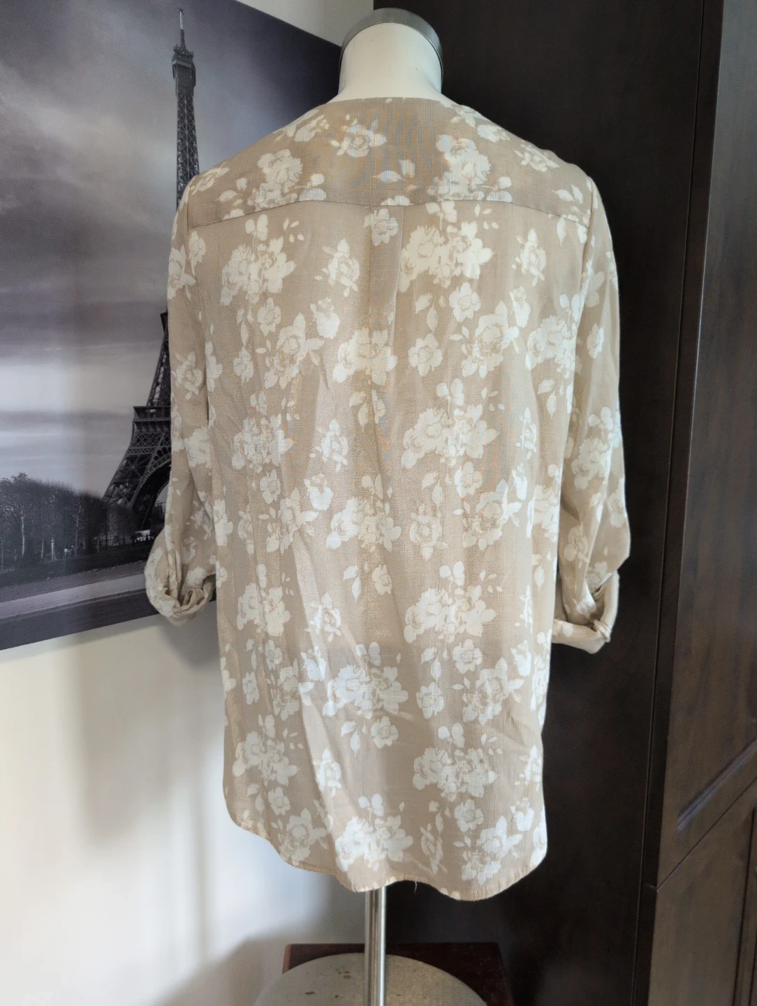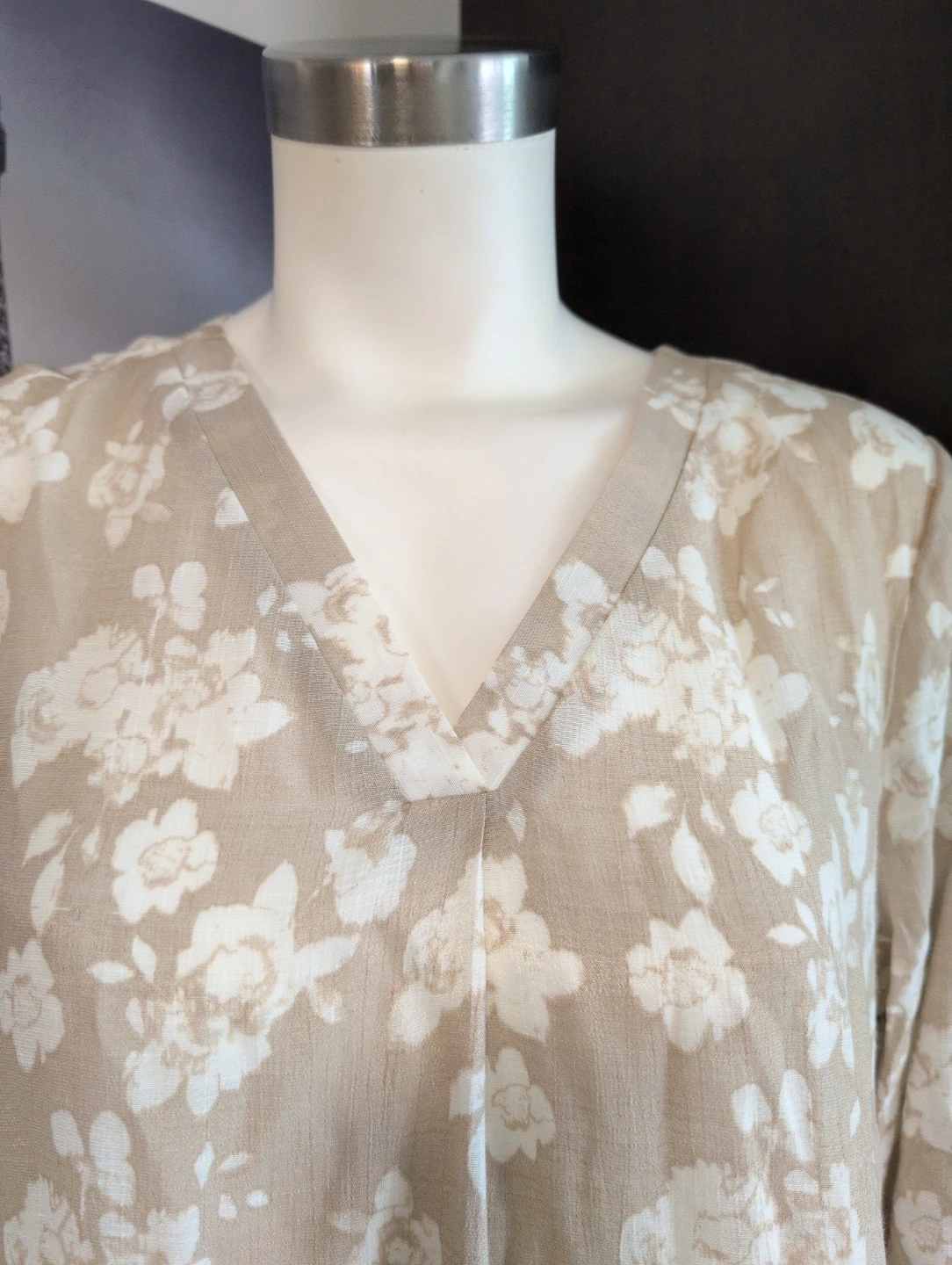 Lightweight beige top with a delicate white floral print. It features a V-neck and roll-tab sleeves for a casual look. Size 10. This top's breezy material makes it perfect for warmer days.