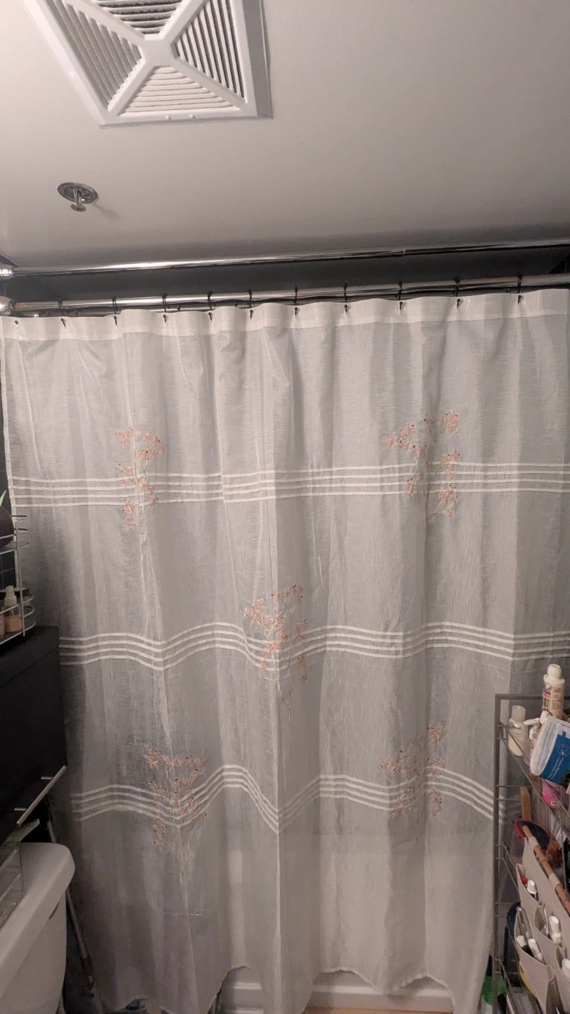 A sheer white shower curtain with a delicate pink floral design and horizontal stripe accents. It's a lovely way to add a touch of style to your bathroom!