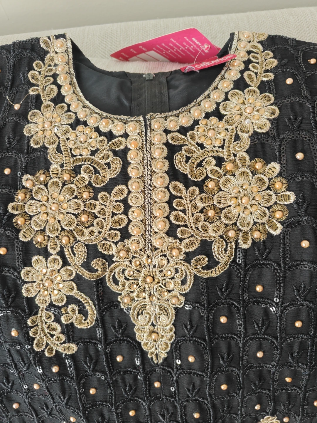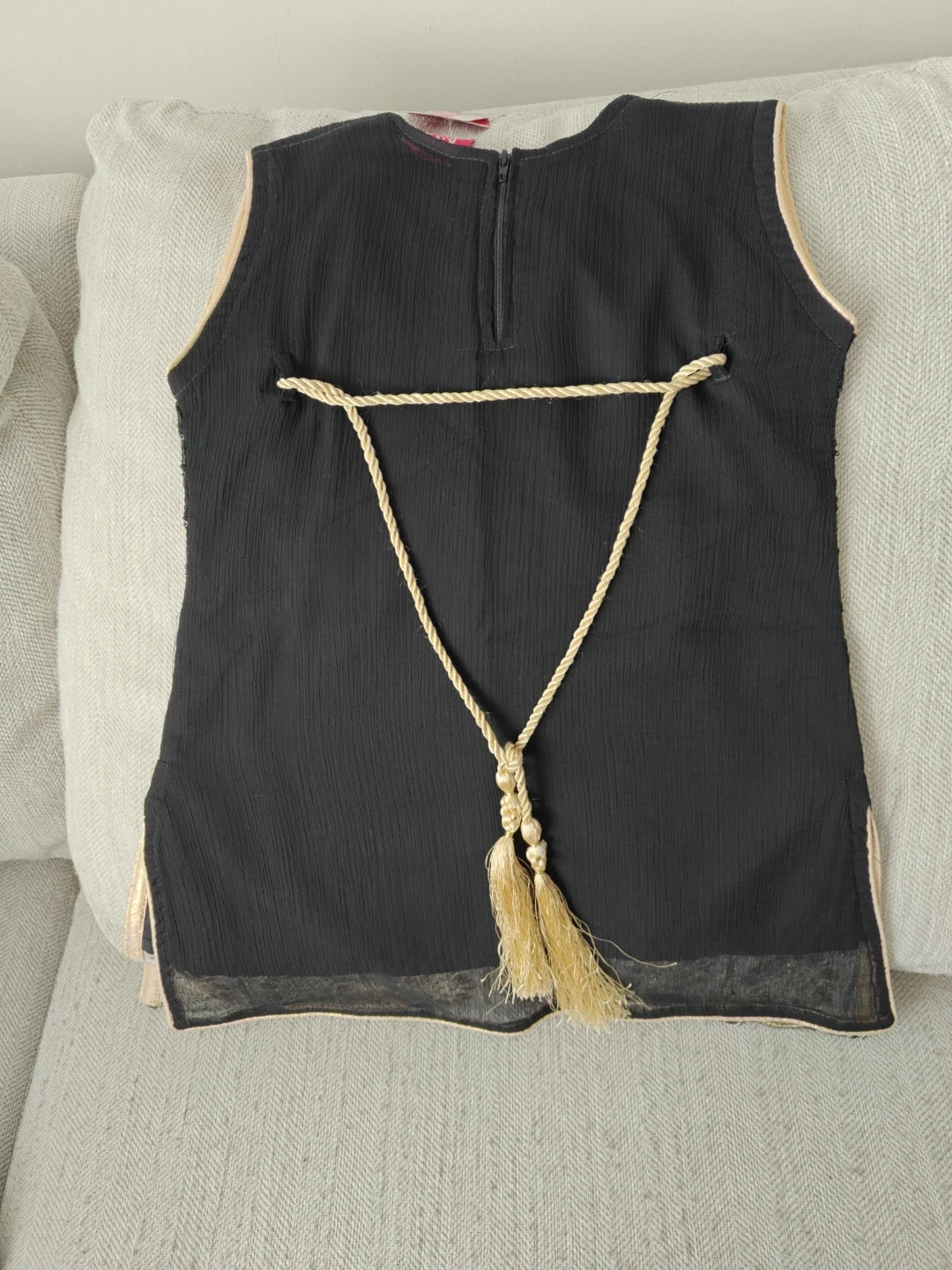 Beautiful black kurti tunic with intricate gold embroidery and beadwork. It features a zippered front and a decorative rope tie with tassels at the back. Perfect for cultural events or festive occasions!