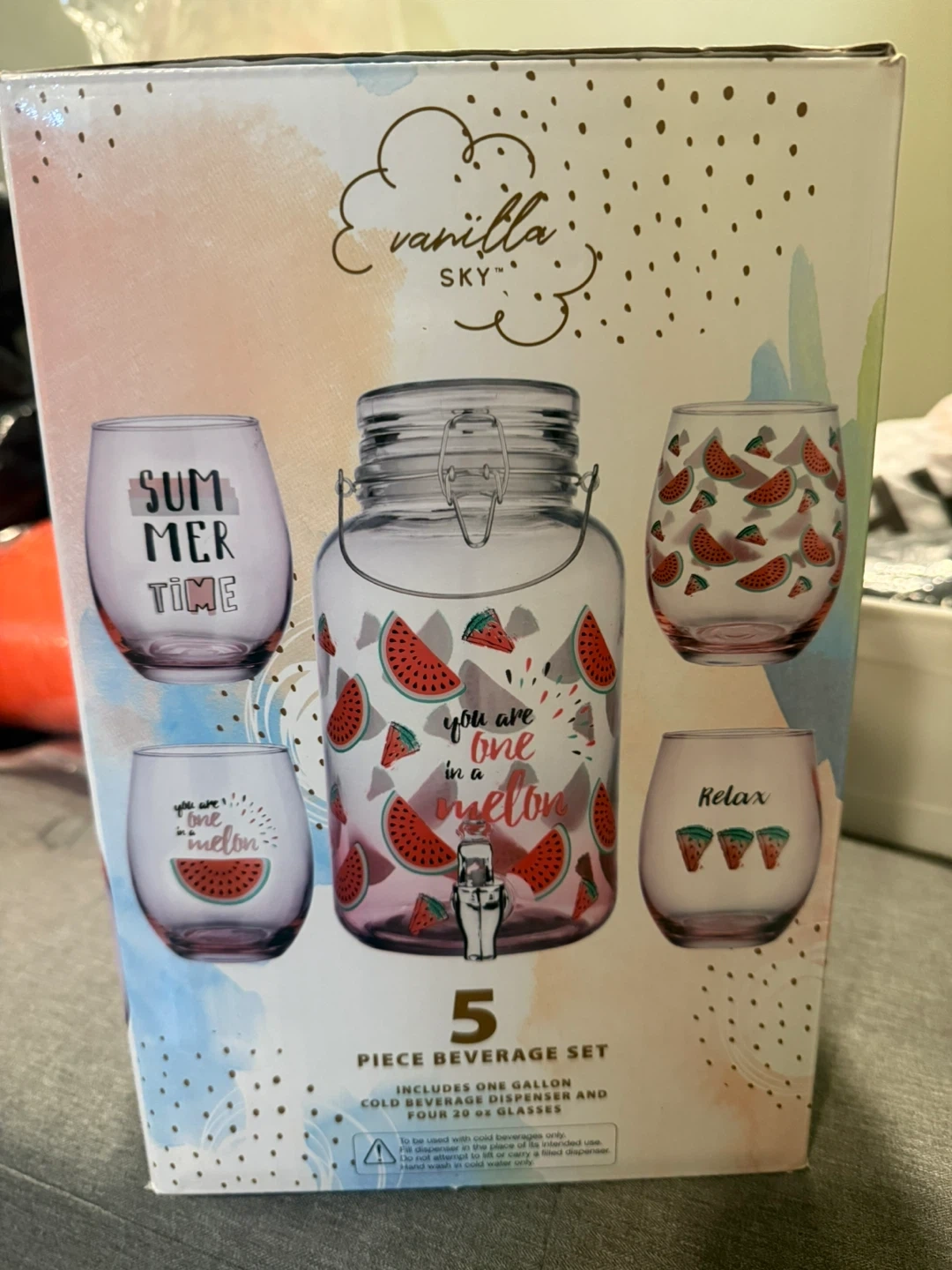 This is a 5-piece beverage set that includes one gallon cold beverage dispenser and four 20 oz glasses. The dispenser and glasses feature a cute watermelon design. It's perfect for serving drinks at parties or gatherings!