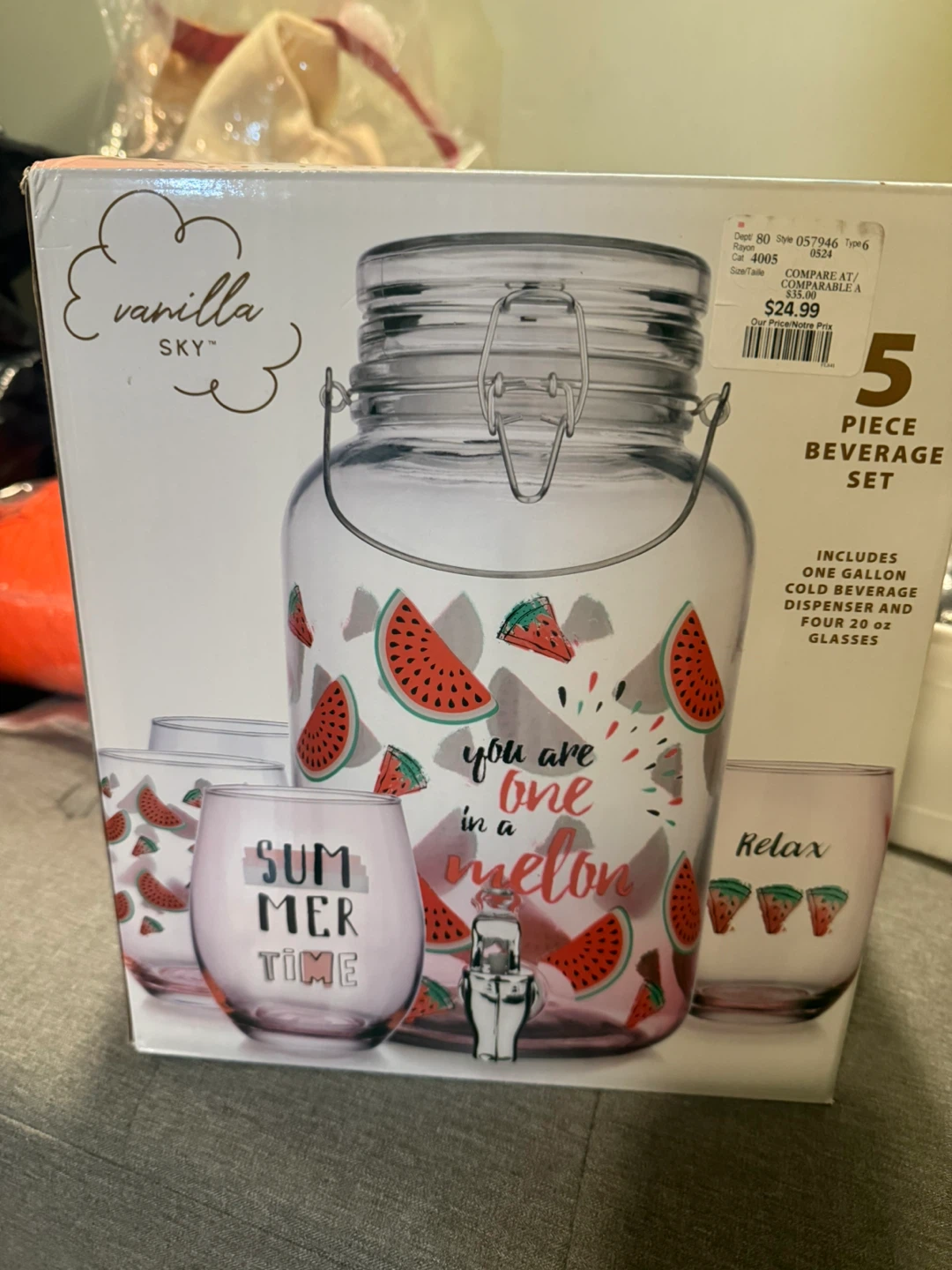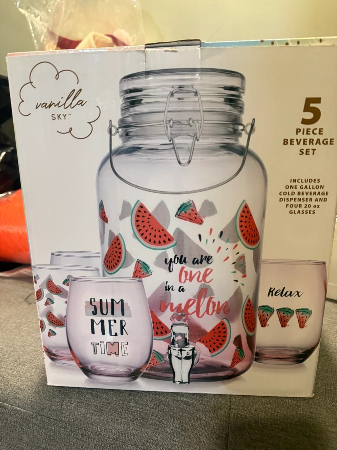 This is a 5-piece beverage set that includes one gallon cold beverage dispenser and four 20 oz glasses. The dispenser and glasses feature a cute watermelon design. It's perfect for serving drinks at parties or gatherings!