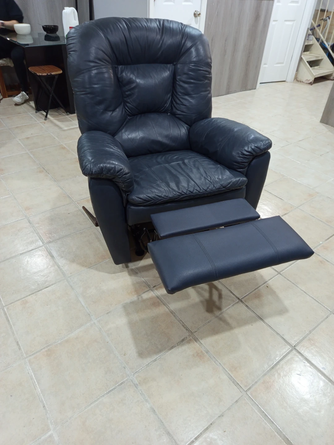 Dark blue leather recliner chair with footrest. It's a comfortable single-seat chair. Upholstered in leather material.