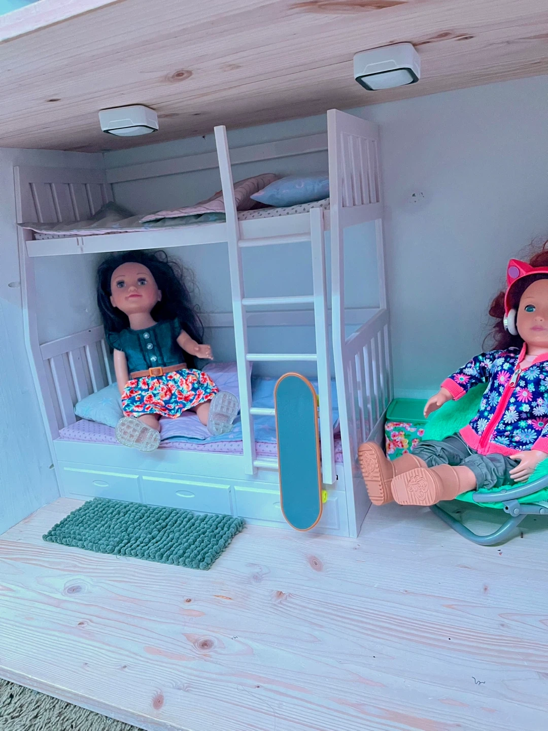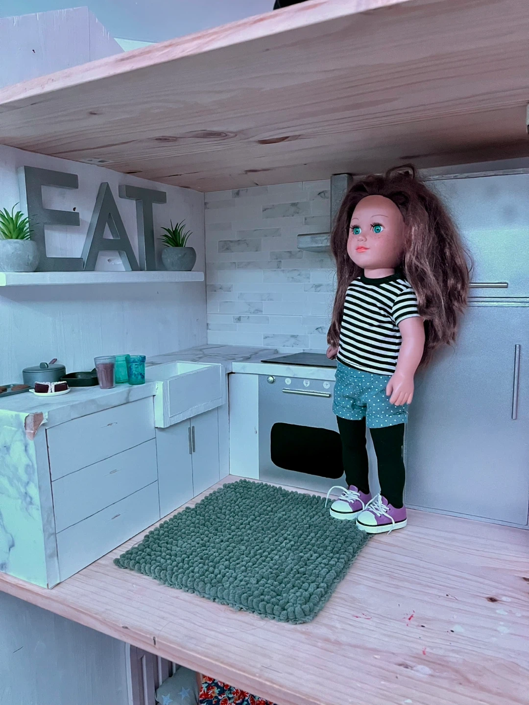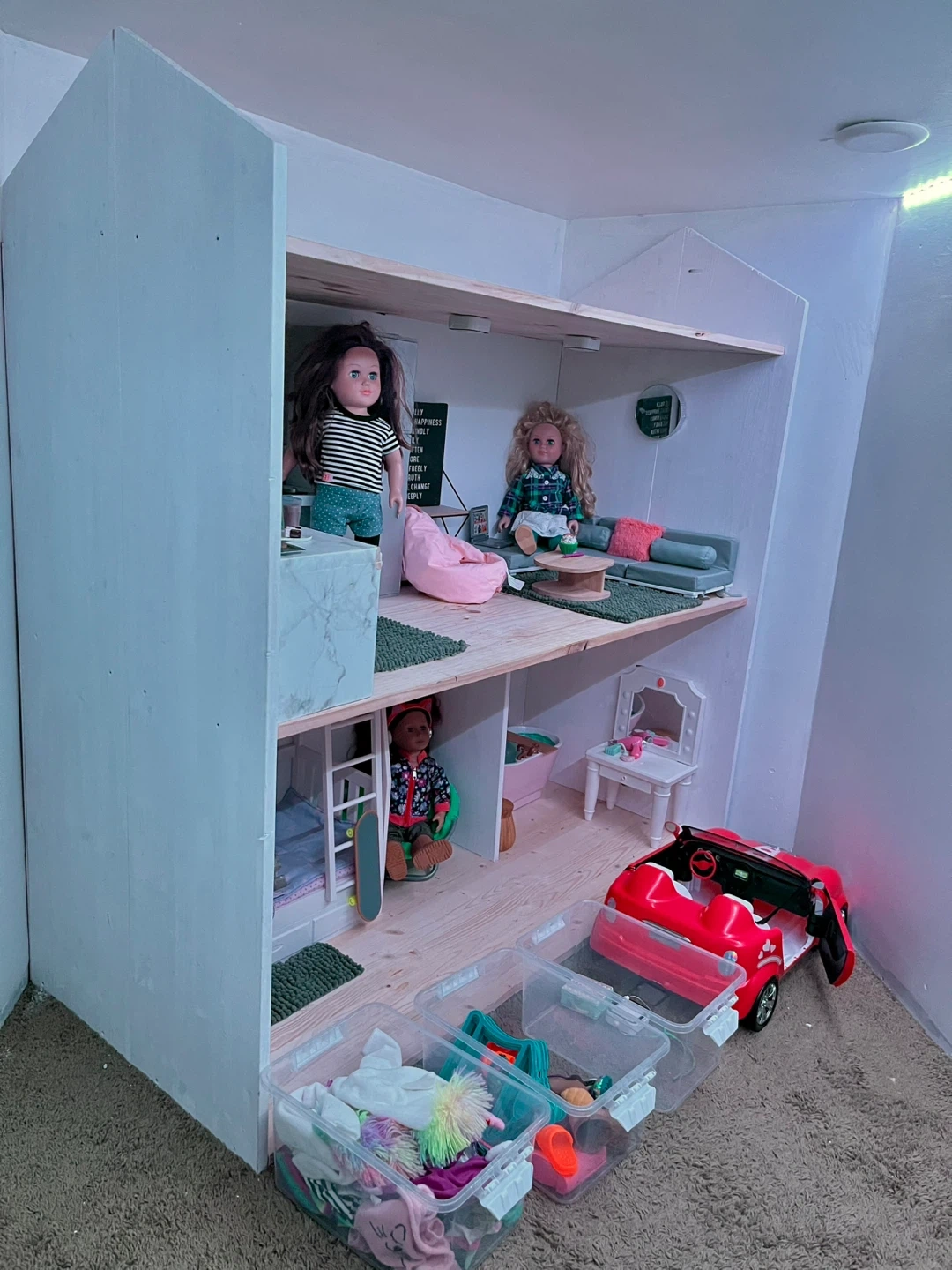 This is a spacious wooden dollhouse, perfect for hours of imaginative play. It includes four 18” dolls and various miniature accessories for a complete setup. Including car, extra clothes and shoes, all furniture and accessories shown in the photos.