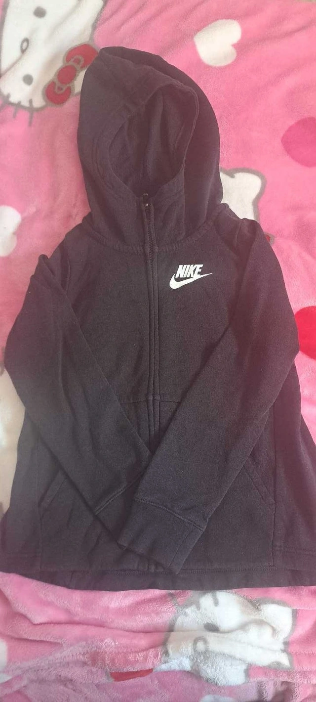 This is a Nike kids' jacket, perfect for keeping your little one warm during cooler weather. It's in good condition, ready for a new home. It's a full zip-up jacket with a hood, featuring the iconic Nike logo. Brand: Nike, Type: Jacket, Colour: Black, Size: Small. Cash accepted.