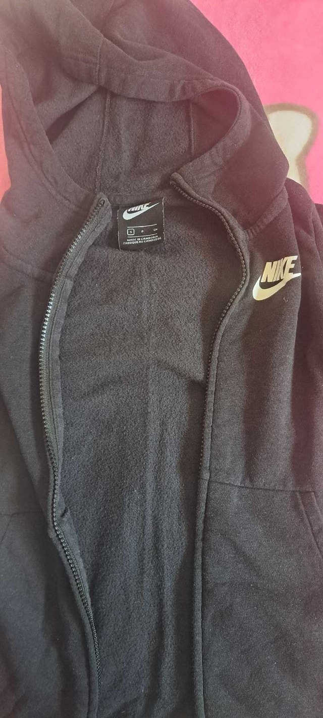 This is a Nike kids' jacket, perfect for keeping your little one warm during cooler weather. It's in good condition, ready for a new home. It's a full zip-up jacket with a hood, featuring the iconic Nike logo. Brand: Nike, Type: Jacket, Colour: Black, Size: Small. Cash accepted.