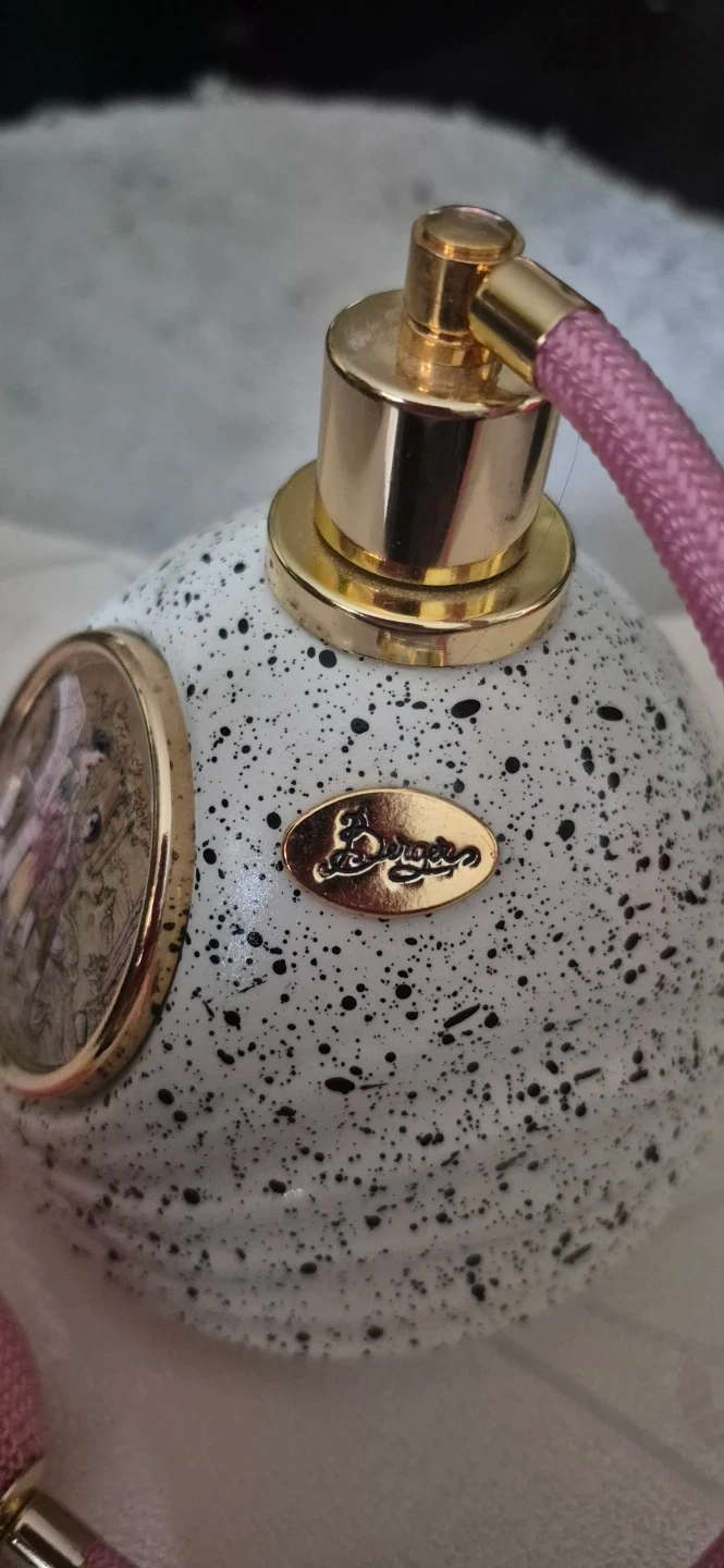Selling a vintage Berger perfume bottle Atomizer, Made in Italy". It has a unique speckled design with a pink atomizer, gold tone and a small oval portrait on the front. It's a beautiful piece for any collector! Open to Offers!